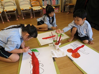 絵の具は子ども達に考えてもらいながら色を準備しました!体や目は色が想像しやすかったですが、羽根は透明・・・「透明って何色?」と問いかけると「薄い灰色かな?」「薄い水色とか!」と案を出してくれました。思い思いに色を選び、体の色もグラデーションにしたり、目を2色にして上手に塗分けたりしていました✨