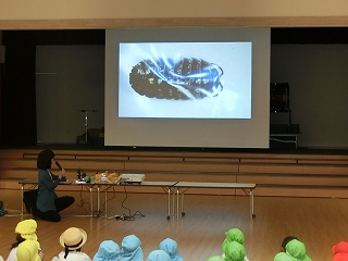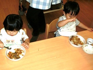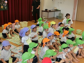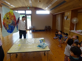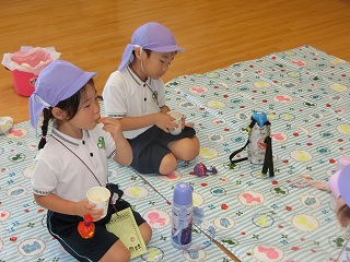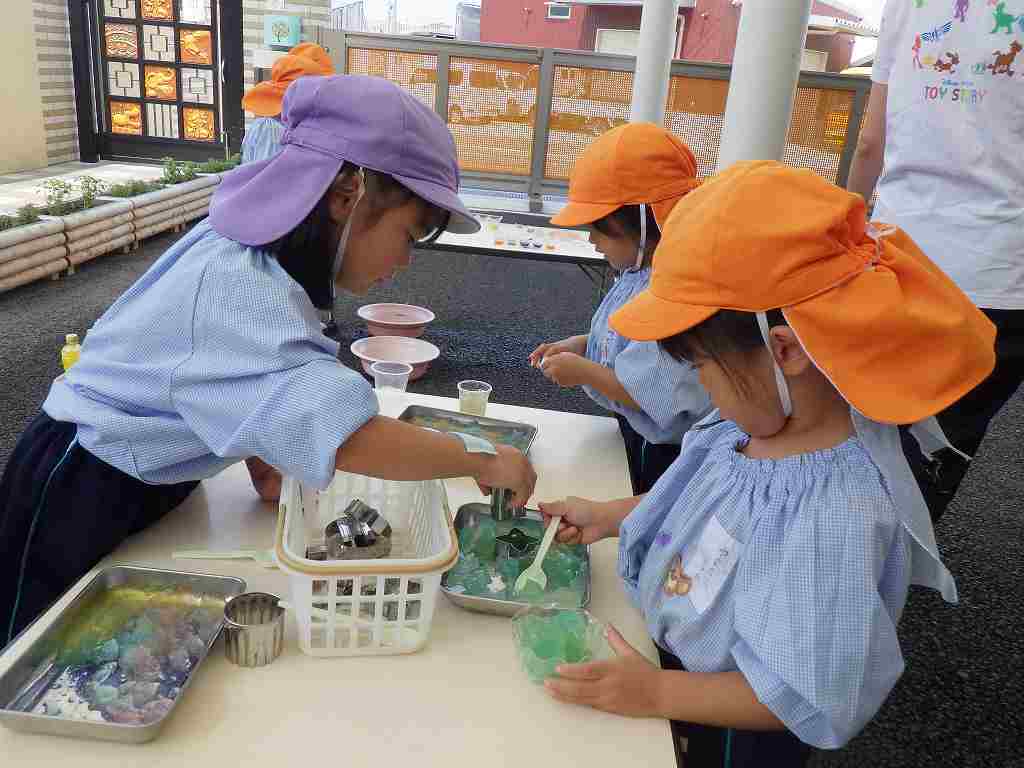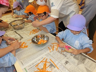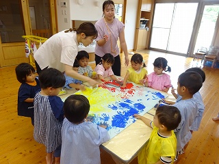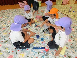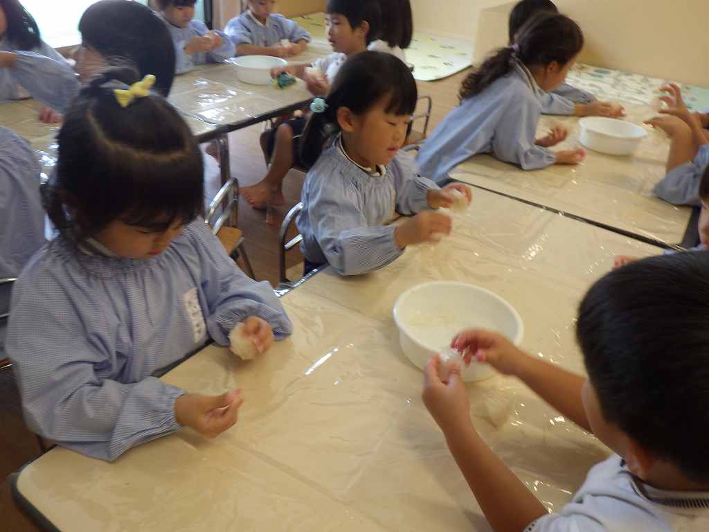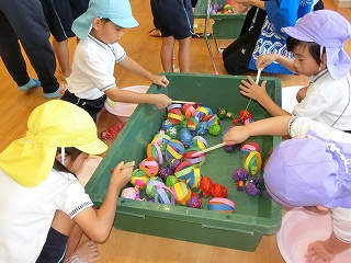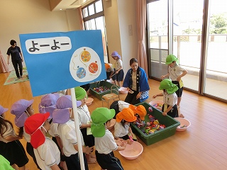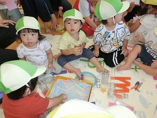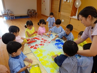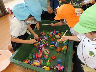 制作遊びでは、どんぐりを作りました。どんぐりに絵の具を付けてコロコロ転がし、一人一人違った模様が完成✨どんぐりが転がる様子をとても楽しんでいました🥰そして、好きな色のクレパスで顔も描いて、可愛いどんぐりが出来ました💕