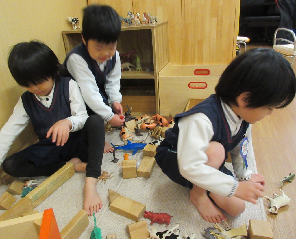 「動物の家を作ろ~!!」「こっちはブタさんの家にして、こっちはライオンね!」と友達と話し合いながら動物の大きな家を作っていました!