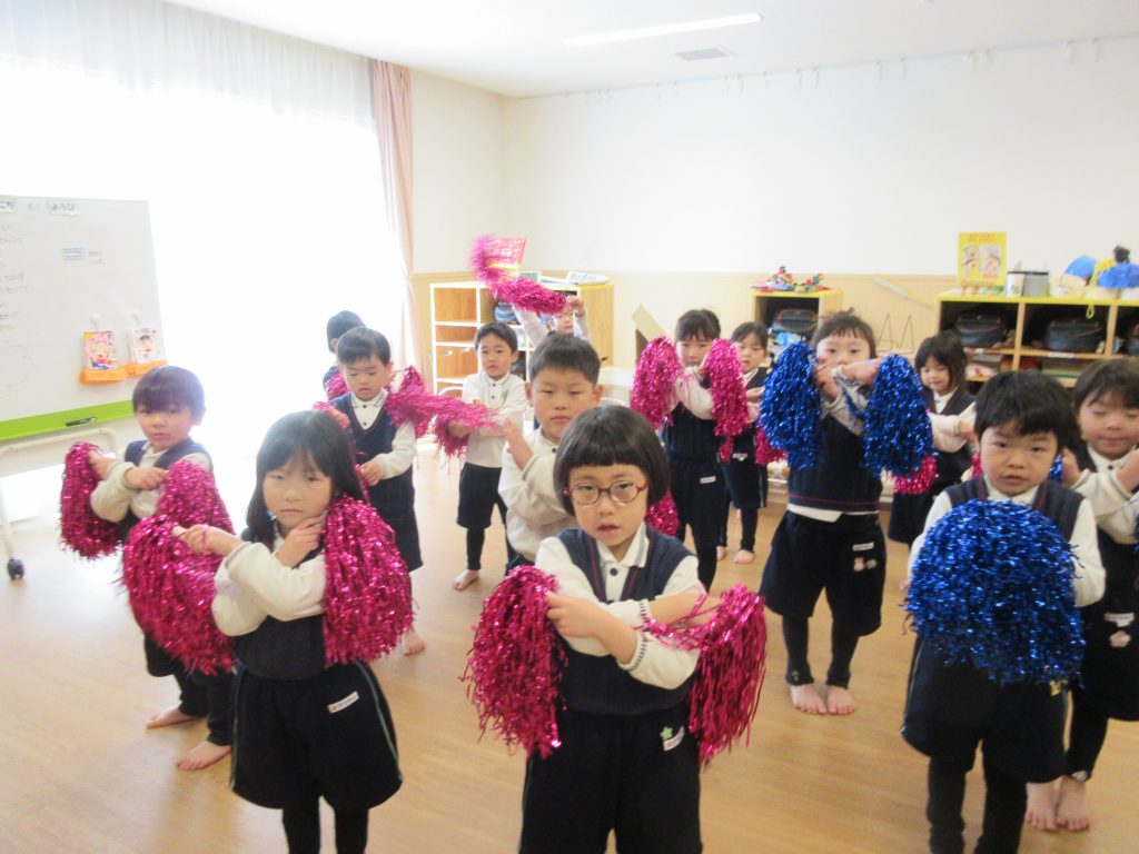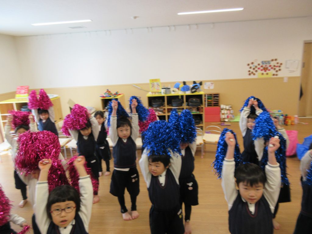 女の子はやっぱりこういうことは得意です👏🏻「もう1回!もう1回!☝🏻」と同じフレーズを意欲的に取り組んでくれます。「こうして手を真っ直ぐにしてから~こう!!」と友達同士で練習する姿が見られました。昼ご飯後も「初めの踊りをしよ~💕」と友達を集め自己練習をする様子もありました。男の子たちは、踊ることが苦手な子どももいますが、一生懸命に女の子を見ながら取り組んでくれます♫この日は、うさぎとぞうのグループに分かれて行いました。うさぎグループはピンクのポンポンをもち、ぞうグループは青のポンポンをもち練習しました。子どもたちは「キラキラポンポンめっちゃいい💕」「これがあったら踊りたくなる~🤩」と目を輝かせながら取り組んでいました✨来年に向けて色々なことに取り組む子どもたちです!!