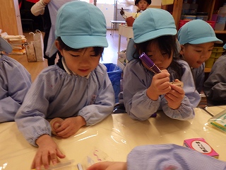 毎日の遊びの中で、少しずつ縫い取りを行ったりしています。始めは、毛糸を通す事に苦戦し「先生!ここどうするの?」と言っていましたが、慣れてくると黙々と取り組む姿が見られるようになりました。