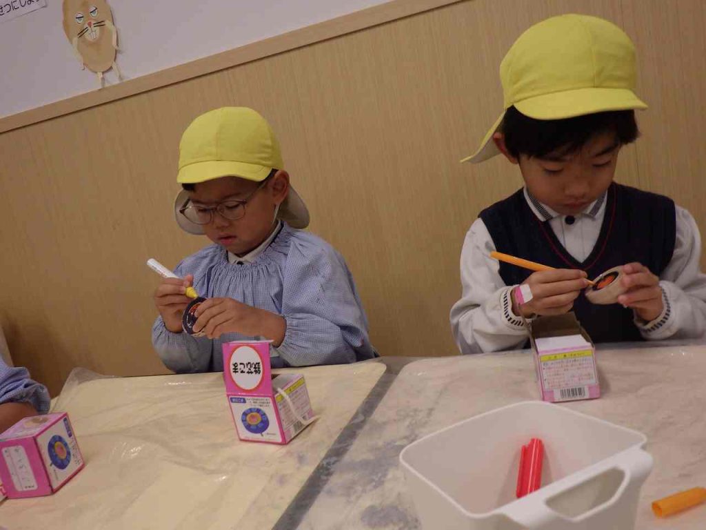 絵の具は混色も慣れてきて、鼠色やクリーム色など、どの色を混ぜたらいいかが分かり、適量を作ることができる子どもも姿も見られました。