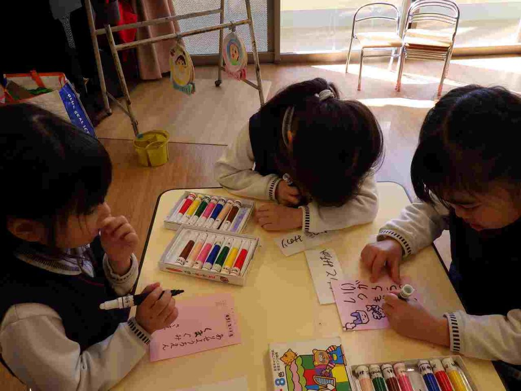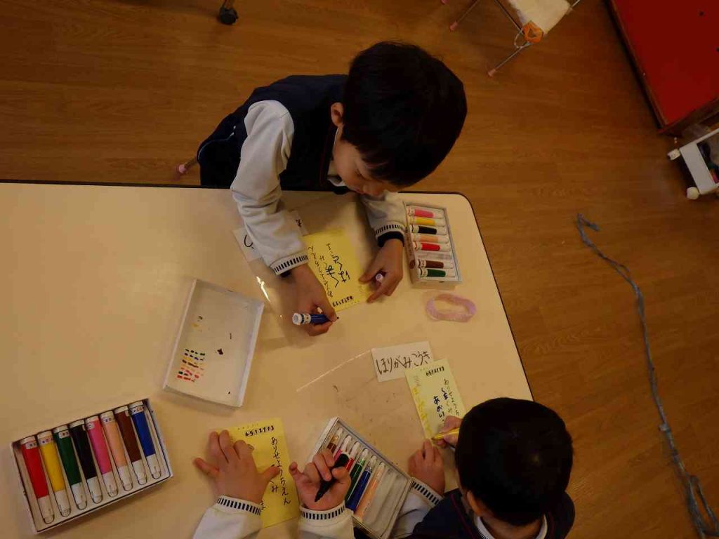 幼稚園から届いた年賀状を見て、お手紙に興味をもった子ども達。ポストやはがきを用意したり、手紙の書き方を知ったりした。「この小さな□は何を書くの?」と郵便番号の箇所を不思議そうに見ていたり「お友だちの名前を書く時、〇〇ちゃんじゃないんだ!〇〇さまなんだって。」と言っていたり、日頃のお手紙と違うところを見付けていました。