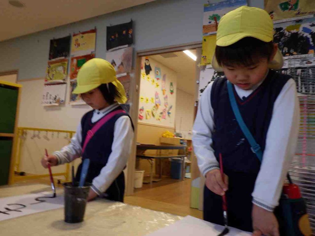 年長になり、様々な文字が書けるようになってきました!とんど祭りには、自分で書いた書き初めを櫓の中に入れて願い事をしました。