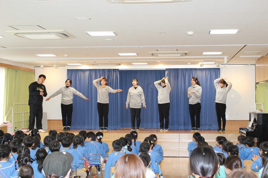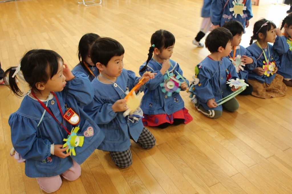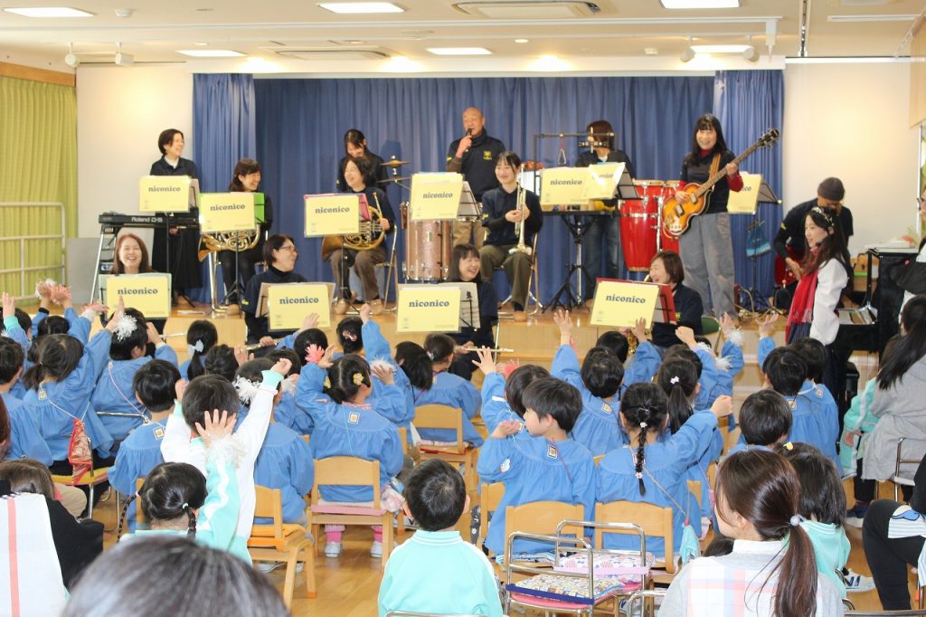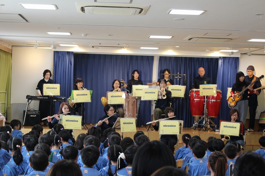 保護者・卒園生のお姉さん(トランペット)・先生たち(フルート)で子どもたちもよく知っている♪勇気100% ♪おどるポンポコリンを演奏したよ!