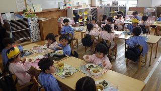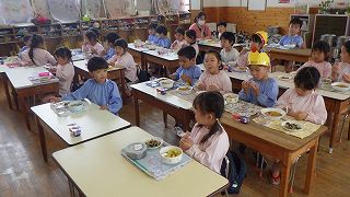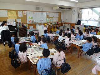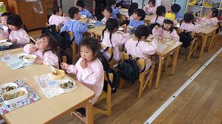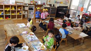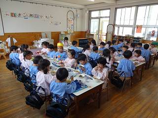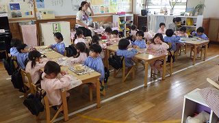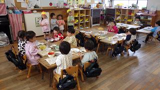 22日に4月生まれの誕生会がありました。年長7人、年中2人、年少3人、もも5人、すもも5人の計22人のお友達、おめでとうございます。誕生月のお友達には、元町ケーキのデコレーションケーキのプレゼントがあります。家族の皆さんでお祝いして一緒に食べてくださったことと思います。