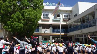 初めての全体集会に間に合うように、きく組さんがこいのぼりを作ってくれました!一番上はふきながし、きく1組は「果物」2組は「食べ物」3組は「動物」をモチーフにしています。みんなで歌を歌うと元気に泳いでくれましたよ!