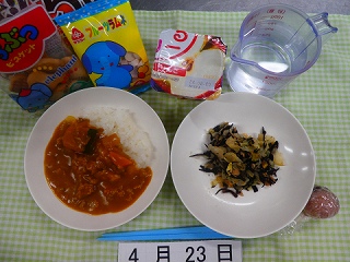 ごちそうのメニューは「カレーライス、ツナとひじきの炒め物、赤飯、ゼリー、お菓子」でした。昔からお祝い事には「赤飯」でしたね。