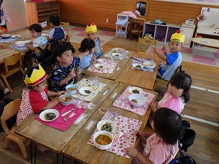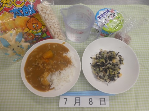 今日のごちそうは、「夏野菜カレー、ひじきとツナの炒め物、赤飯、お菓子、プリン」でした。カレーは、「南瓜、にんじん、玉ねぎ、ナス、ピーマン」と夏バテにならない夏の野菜がたくさん入っていて、とてもおいしかったです。