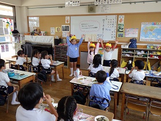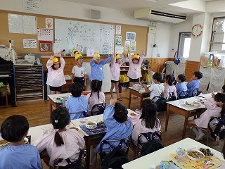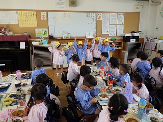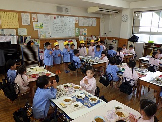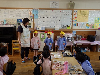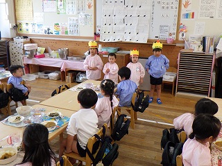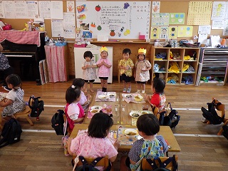 日に7、8月生まれの誕生会をしました。7月は年長3名、年中9名、年少6名、もも2名、8月は年長6名、年中3名、年少6名、もも3名、の38名のお友達おめでとうございます!!元町ケーキさんの素敵なケーキを家族の人数に切り、いただいてくださいましたか。「あぁ~美味しかった!」