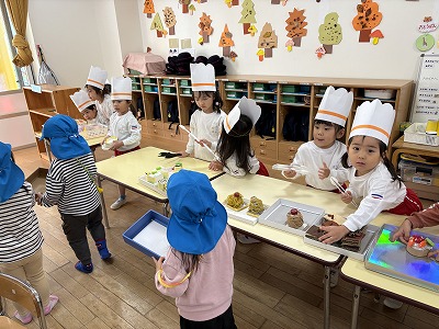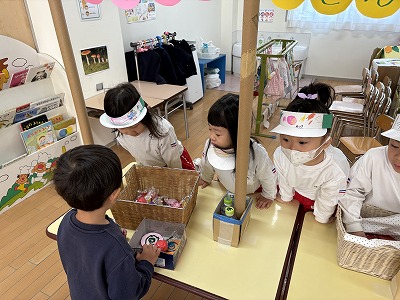 乳児園のはな組(2歳児)さんを、年少組の「お店やさんごっこ」に招待しました。