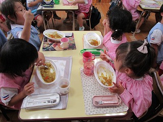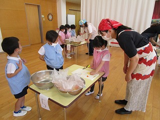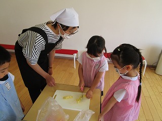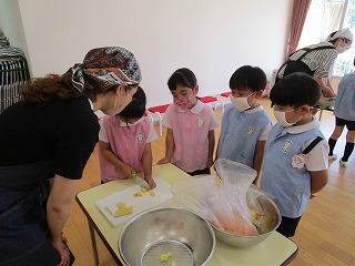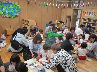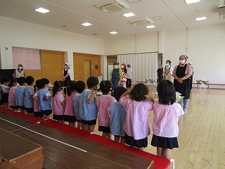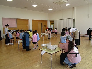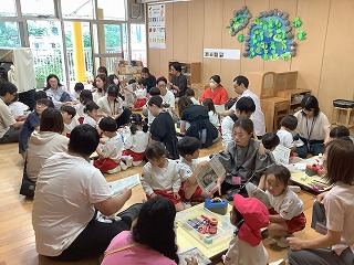 乳児園のはな組(2歳児)さんを、年少組の「お店やさんごっこ」に招待しました。