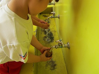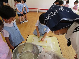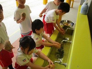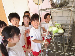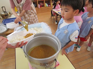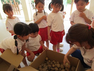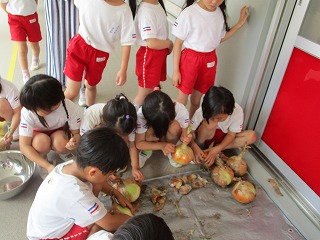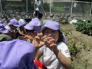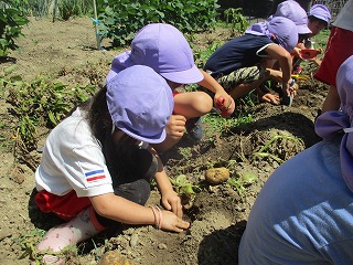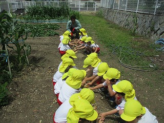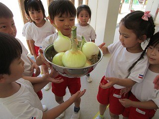 年中組は、畑にタマネギの苗を植えました。来年、年長組になってカレークッキングをする時に、このタマネギを収穫して調理します。