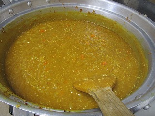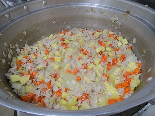 前日に子どもたちが洗ったもち米を、蒸籠(セイロ)で蒸します。