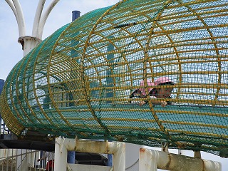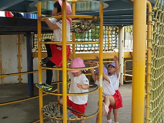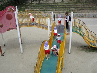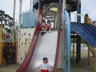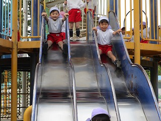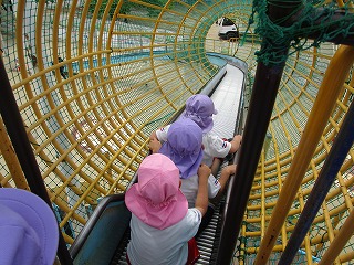 緑に囲まれた緑地内を散策したり、子どもの楽園では、長さ20メートルのローラースライダーを滑ったりして、友だちと一緒に楽しく遊びました