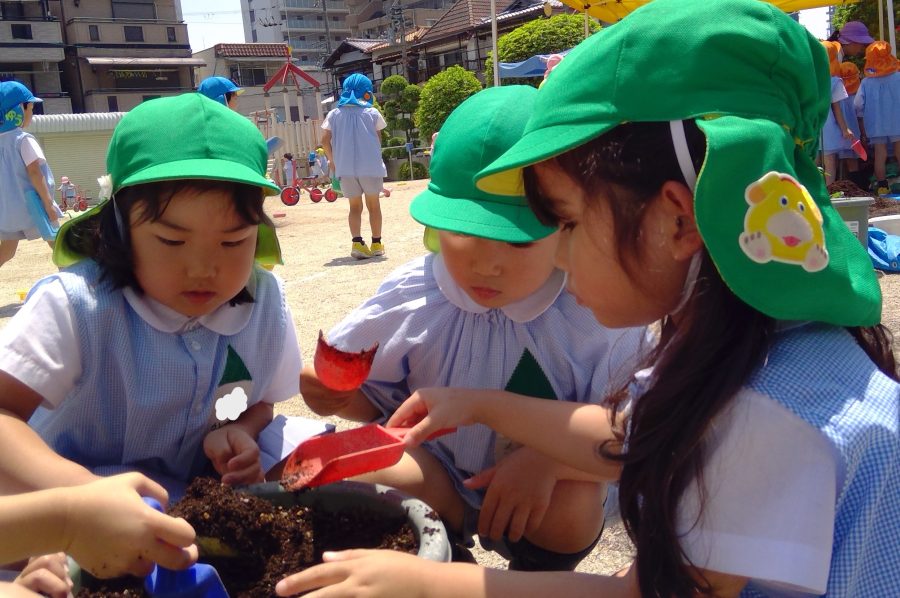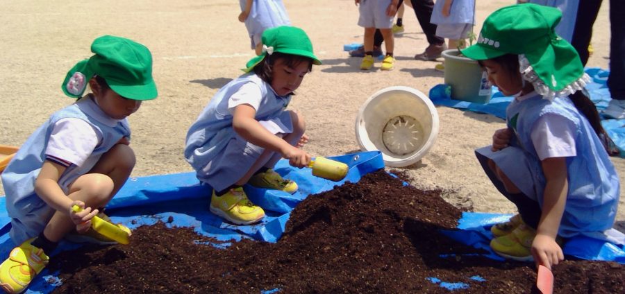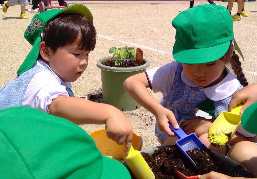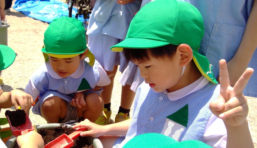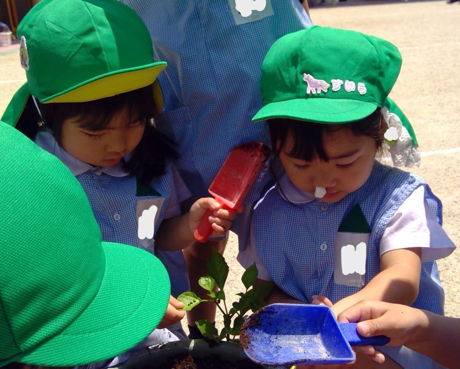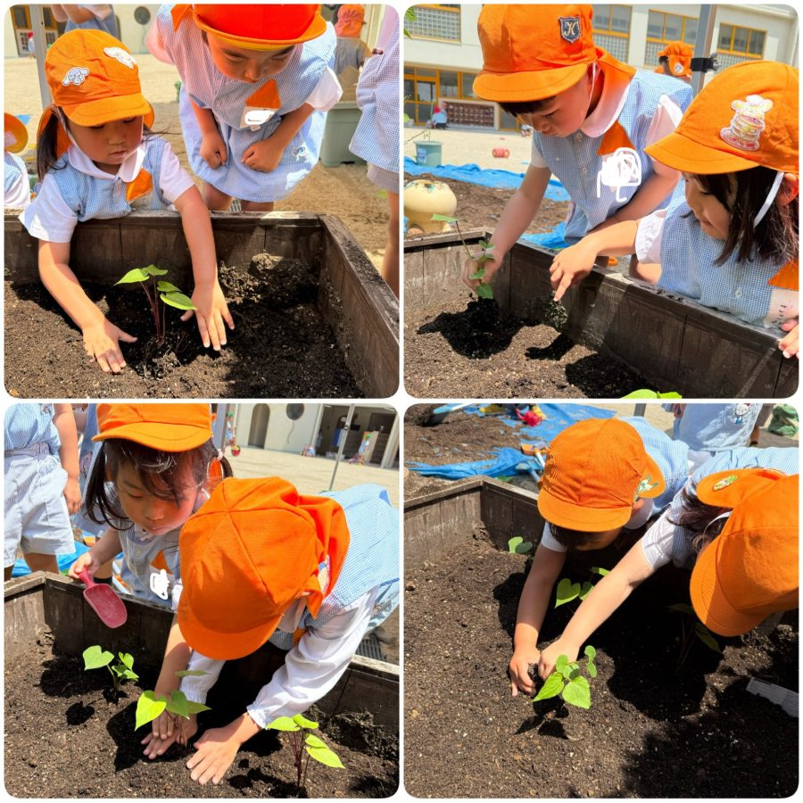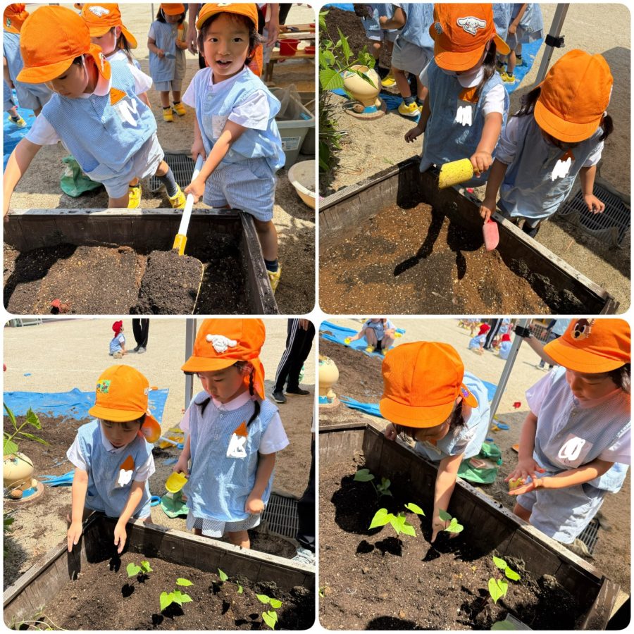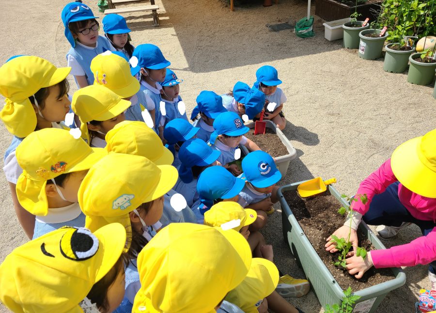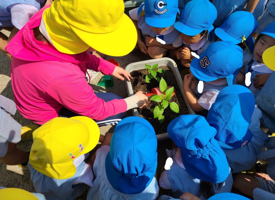 先週に、年長さんは2つ野菜を植えました!植えたのは、トマトとピーマン。ピーマンはカラーピーマンも植えました!どんな風に育つか楽しみです。