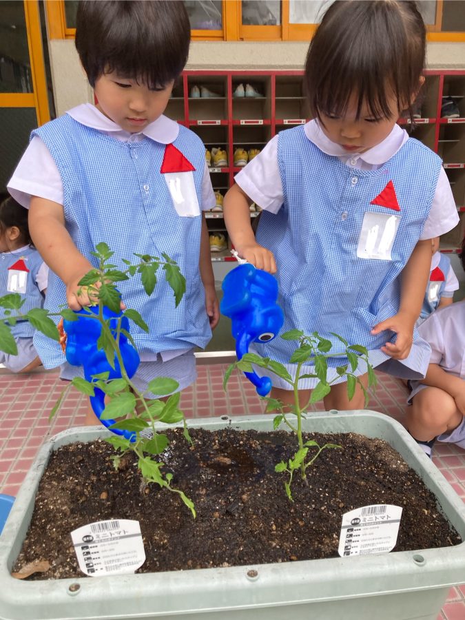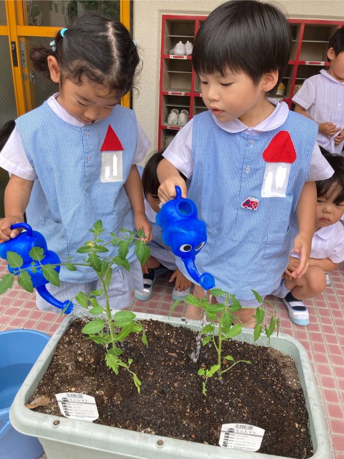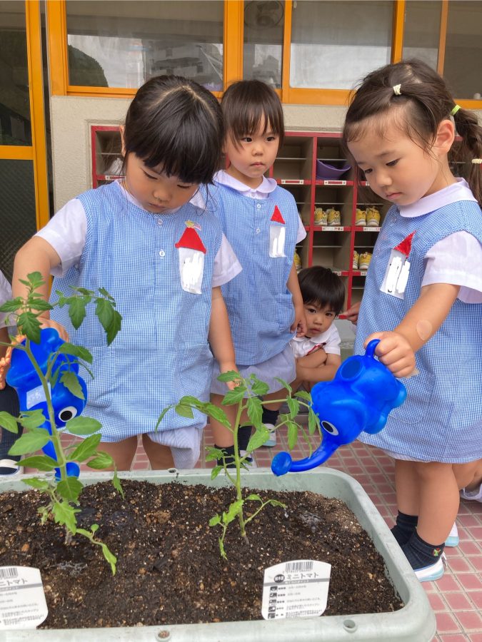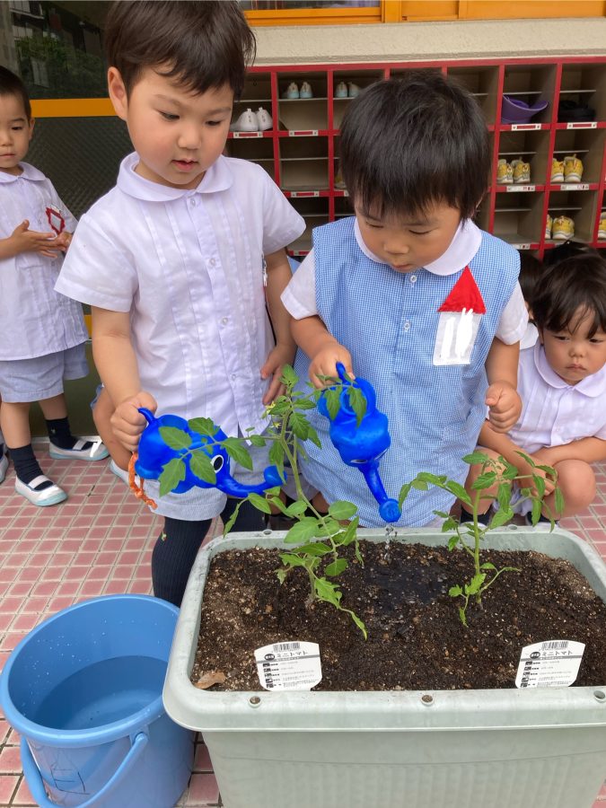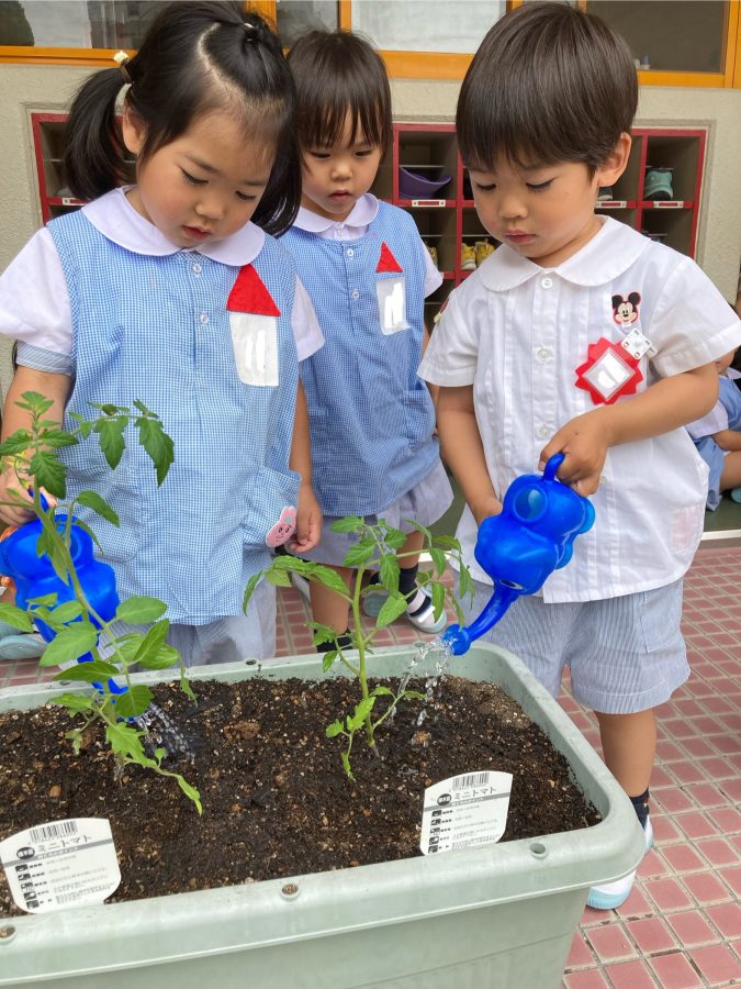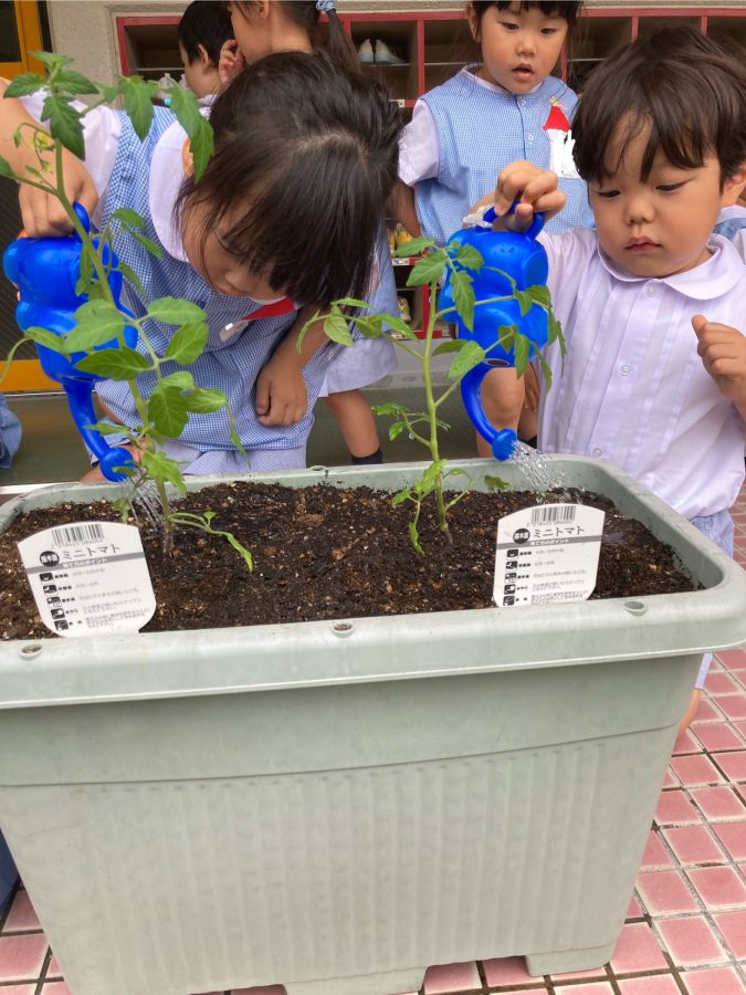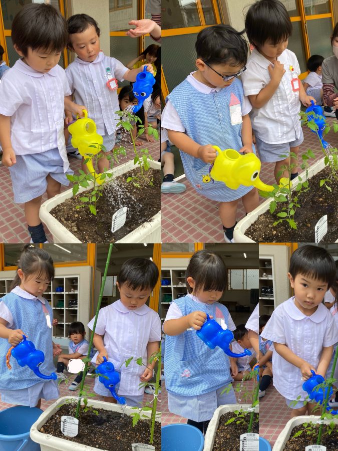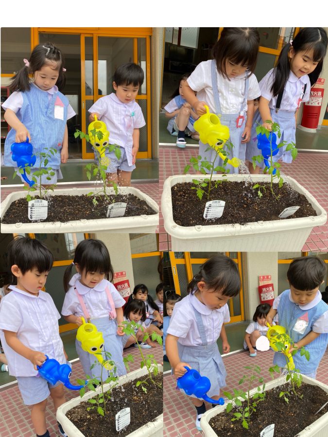 次の日からお外遊びの時間に 順番にお名前を呼んで ジョウロでコツコツお水をあげています。「ミニトマトまだかな?」と探していたり 「お花!」と苗から咲いているお花を見て観察しながら興味をもっている姿が見られます!