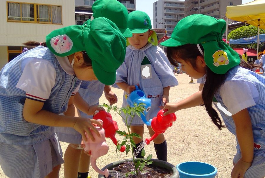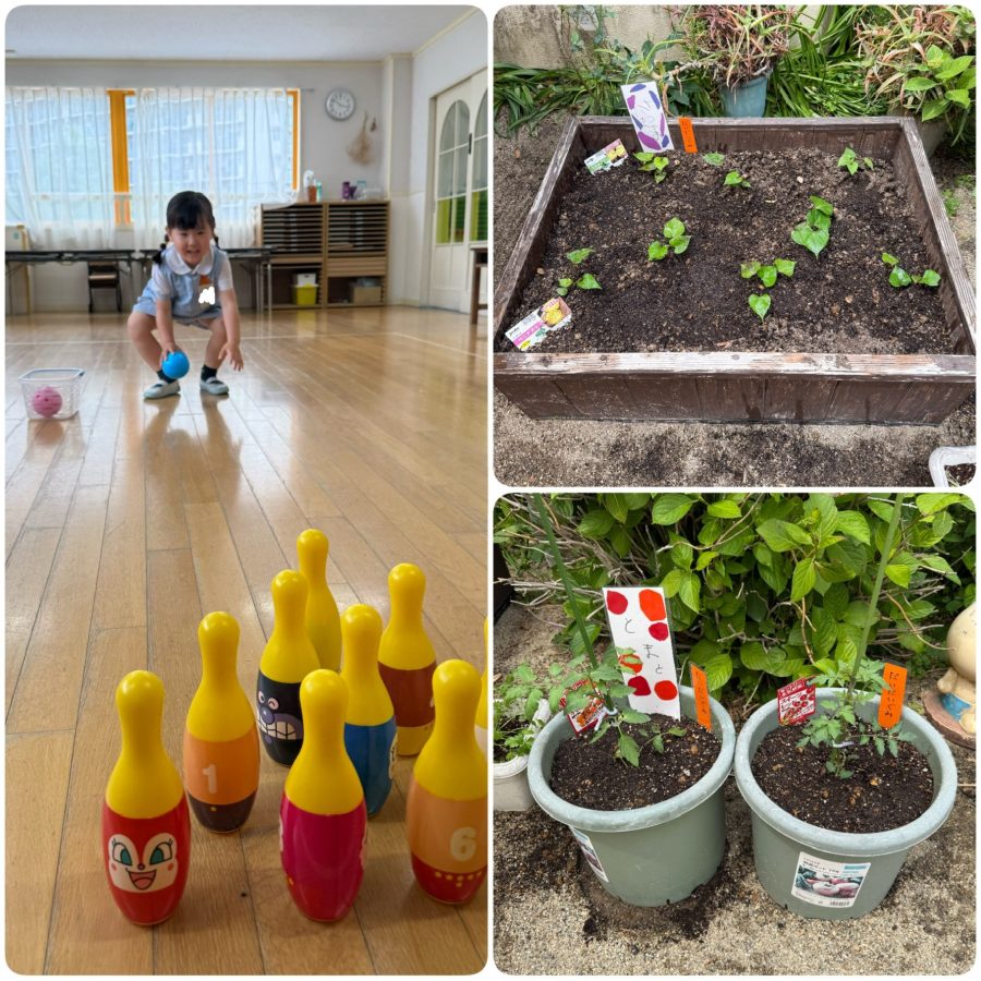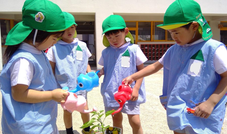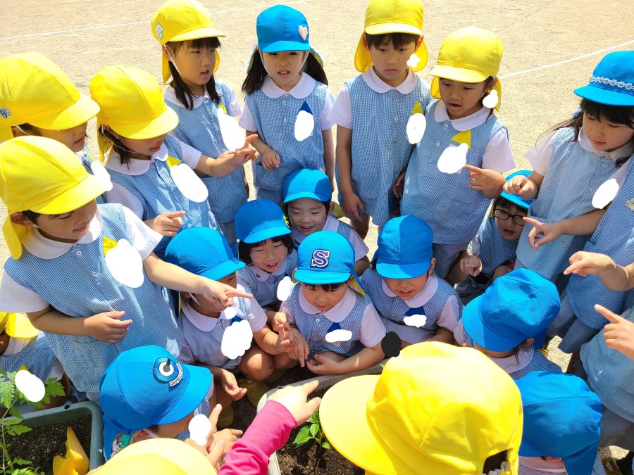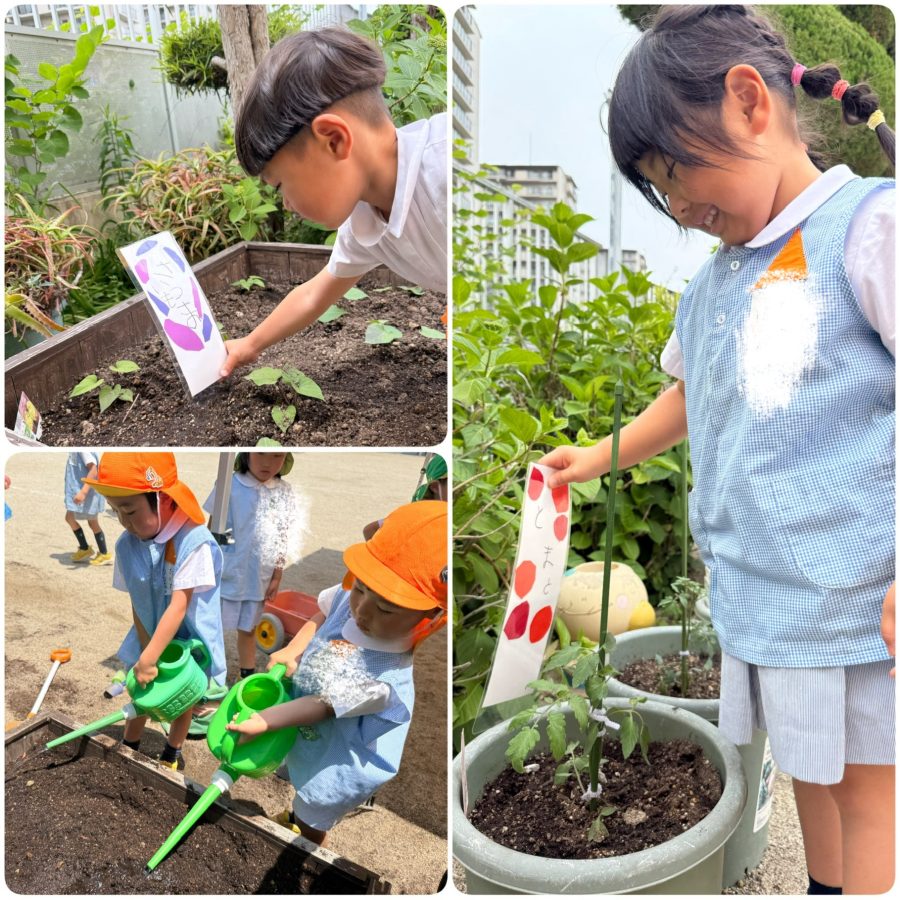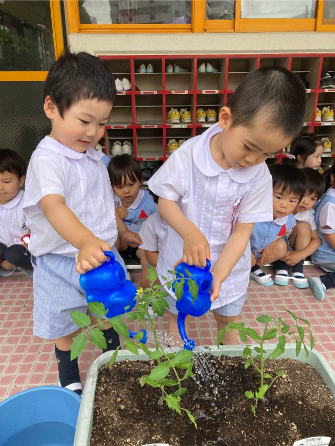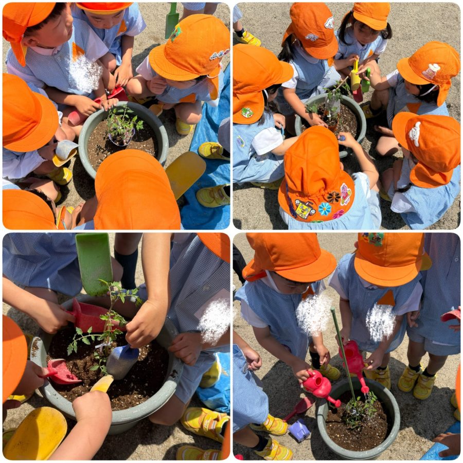 次の日からお外遊びの時間に 順番にお名前を呼んで ジョウロでコツコツお水をあげています。「ミニトマトまだかな?」と探していたり 「お花!」と苗から咲いているお花を見て観察しながら興味をもっている姿が見られます!