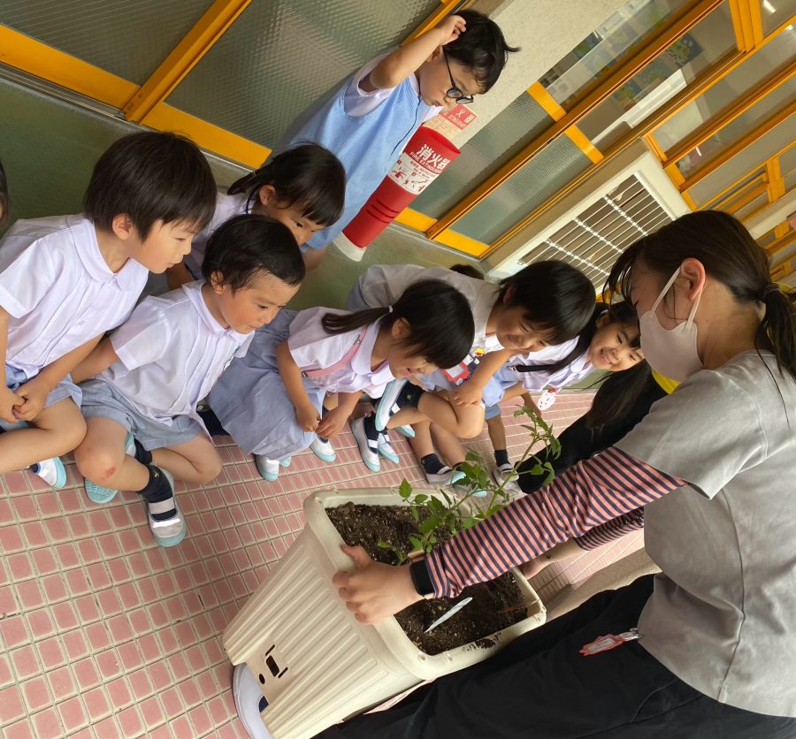 その後はお部屋の前に出て、桃組さんと合同でトマトを植えました。