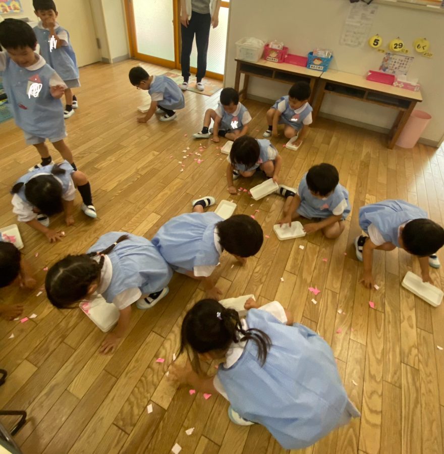 また 今週は初めてハサミ制作をしました!折り紙を6等分に切った細い紙を1人2枚ずつ渡し 1回切りにチャレンジしました✂️ ちょっぴりドキドキしながらも 先生と一緒に持ち方や使い方を確認して 真剣な表情で紙を切っていた子ども達でした!✨