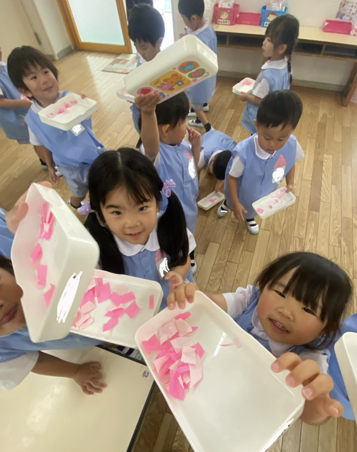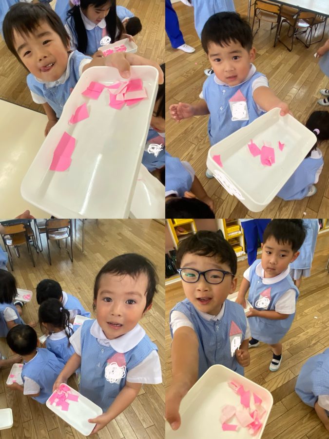 切り終わった後は それぞれ切った紙を粘土蓋に集め 両手に持って嬉しそうに見せてくれました!