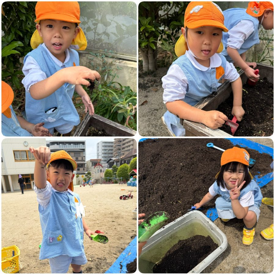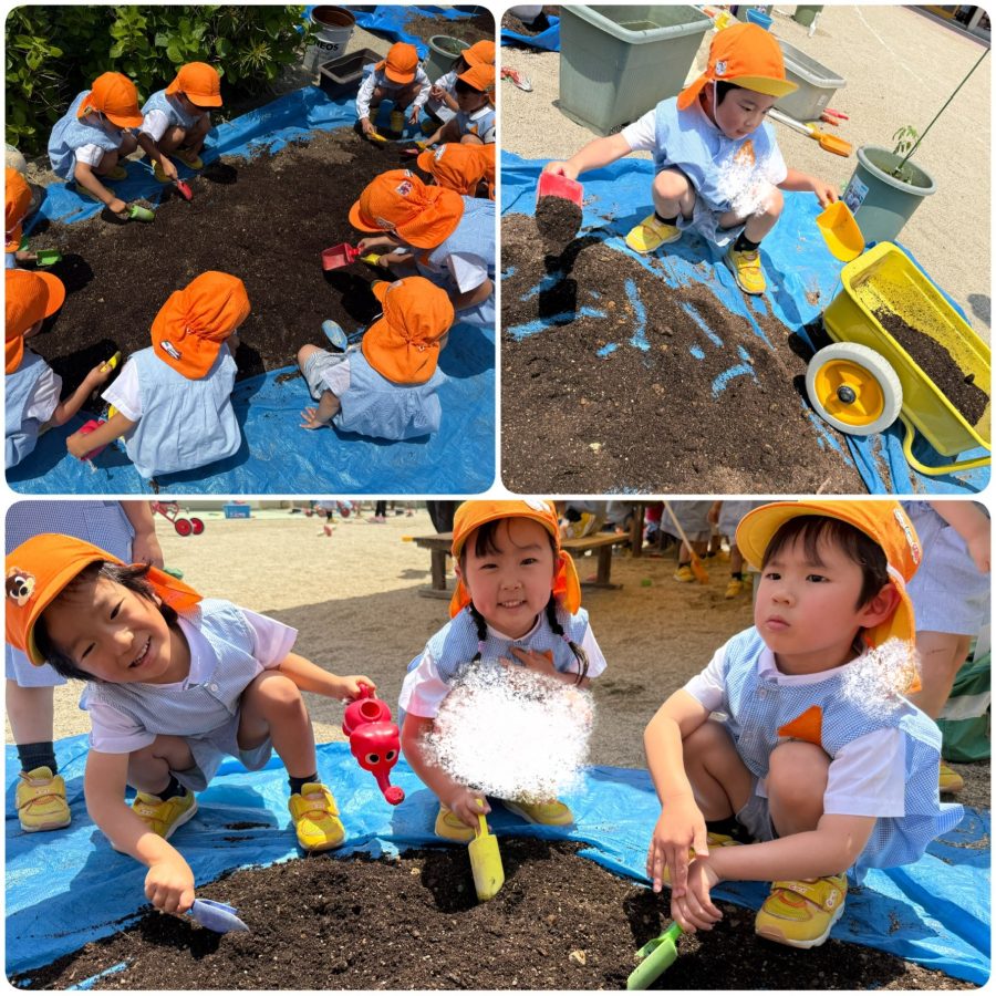 土に埋まった苗を見てわあ〜と目をきらきらしている桃組さん🤭「みんなでお水あげる〜?」と声を掛けると 「あげる〜!」と元気いっぱいの声が返ってきました!