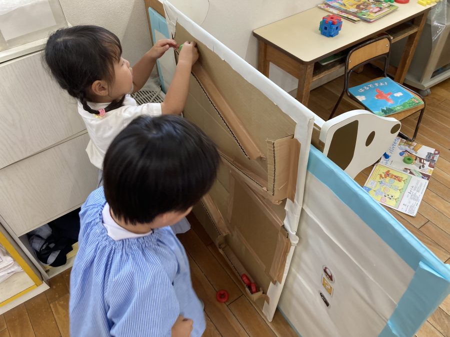 キッチンは女の子に、壁の仕掛けは男の子に人気です。導入早々破壊されるアクシデントなどもありましたが、修復、試行錯誤しながらお部屋遊びも充実できないか日々検討中です🤔