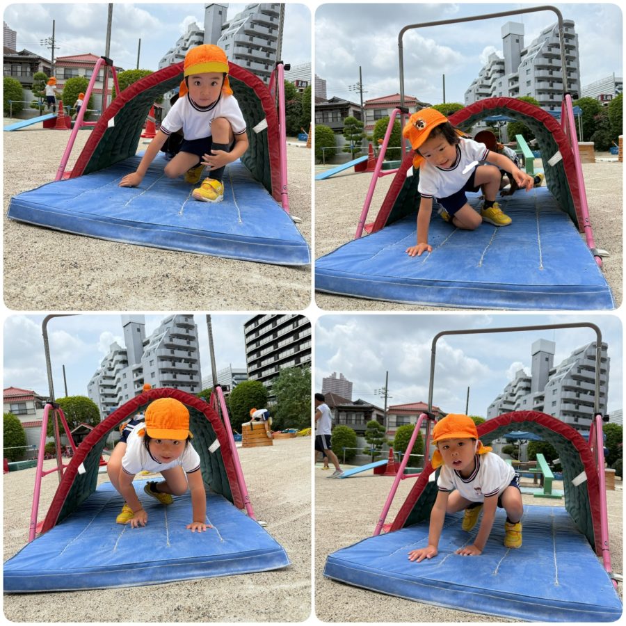 マットのトンネルをハイハイの姿勢でくぐり抜けます!