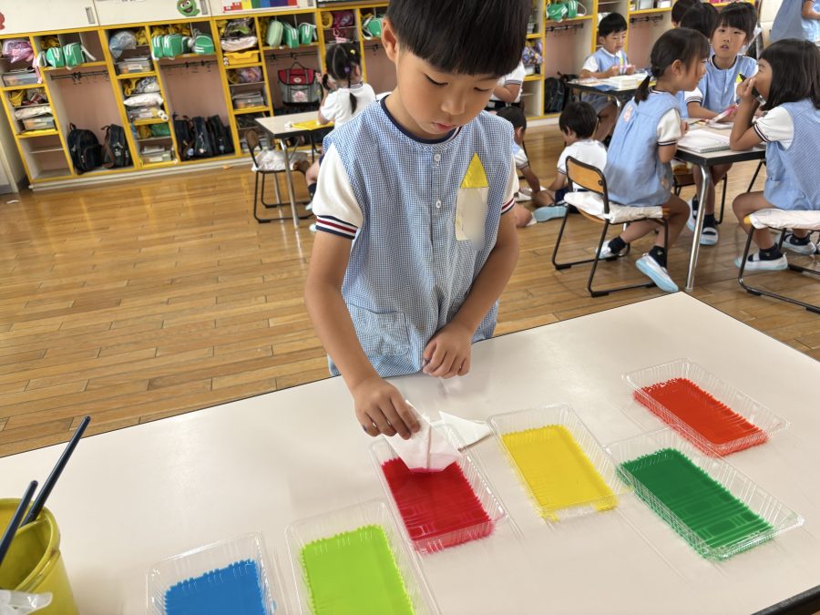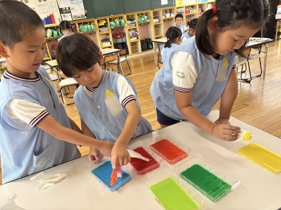 和紙に絵の具が広がって行く様子に思わず「うわぁ〜!」と声が出てしまう黄組さんたち🤭