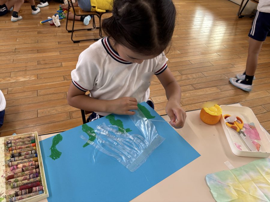 綺麗に染まった和紙は、翌日クラゲの形と魚やメンダコの形を描いて切り、画用紙に貼り付けます🖍️