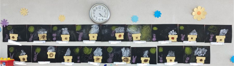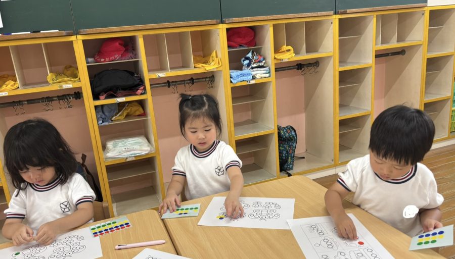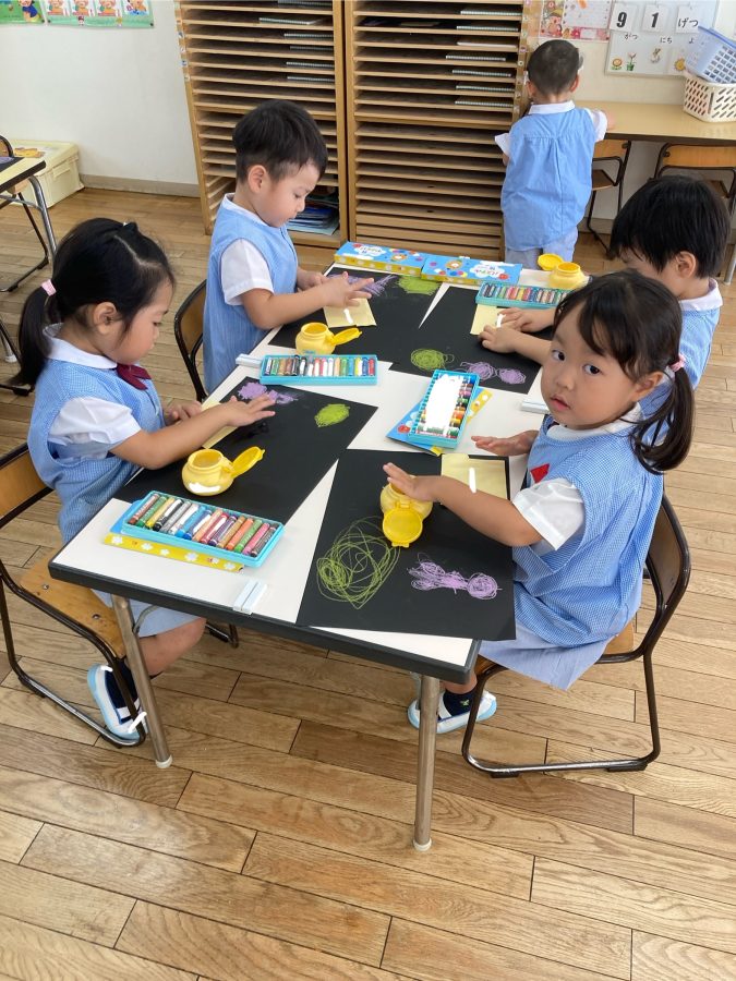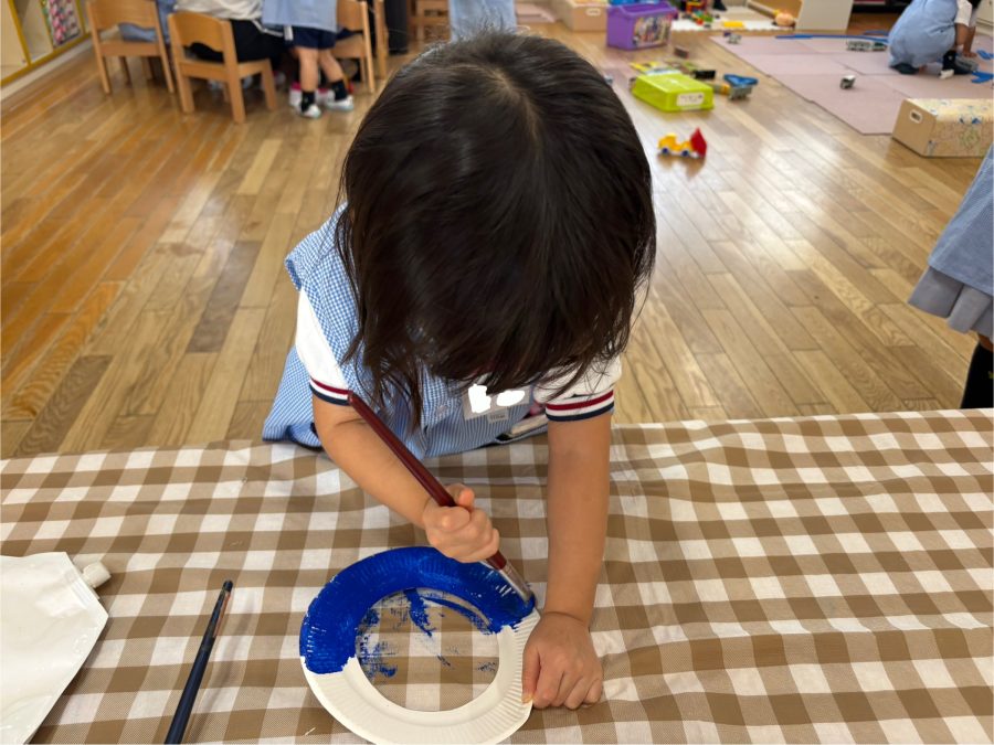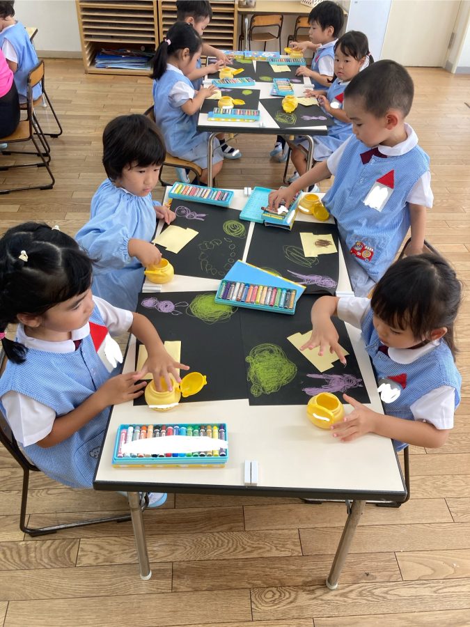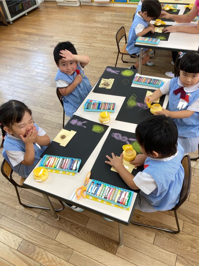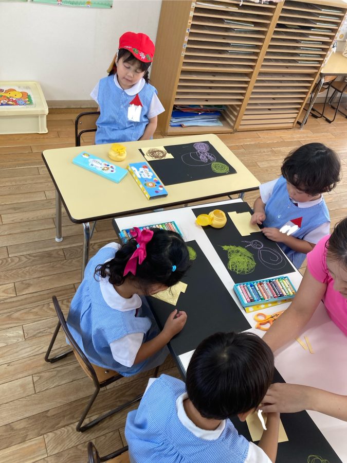 さて、初めの月曜、火曜日は9月の壁面制作をしました!のり、ハサミ、クレパスと、始まって早々に様々な道具を駆使して頑張っていました☺️