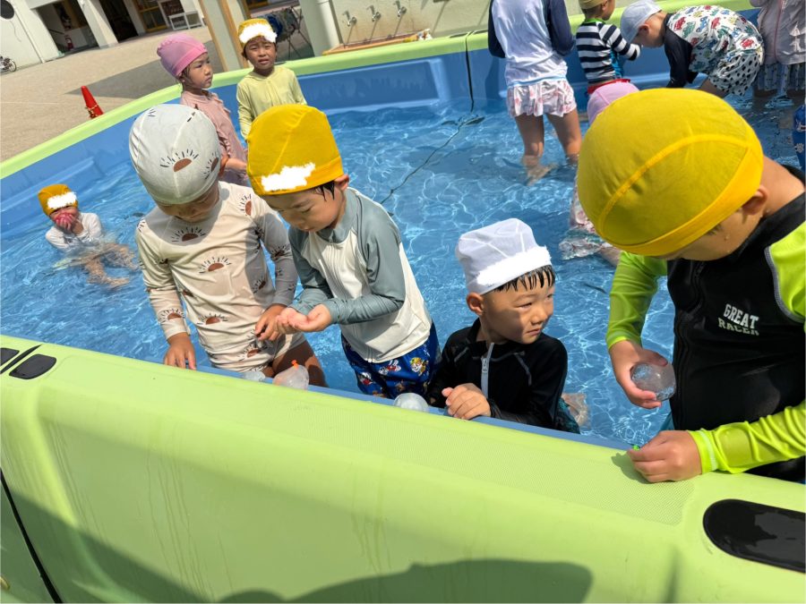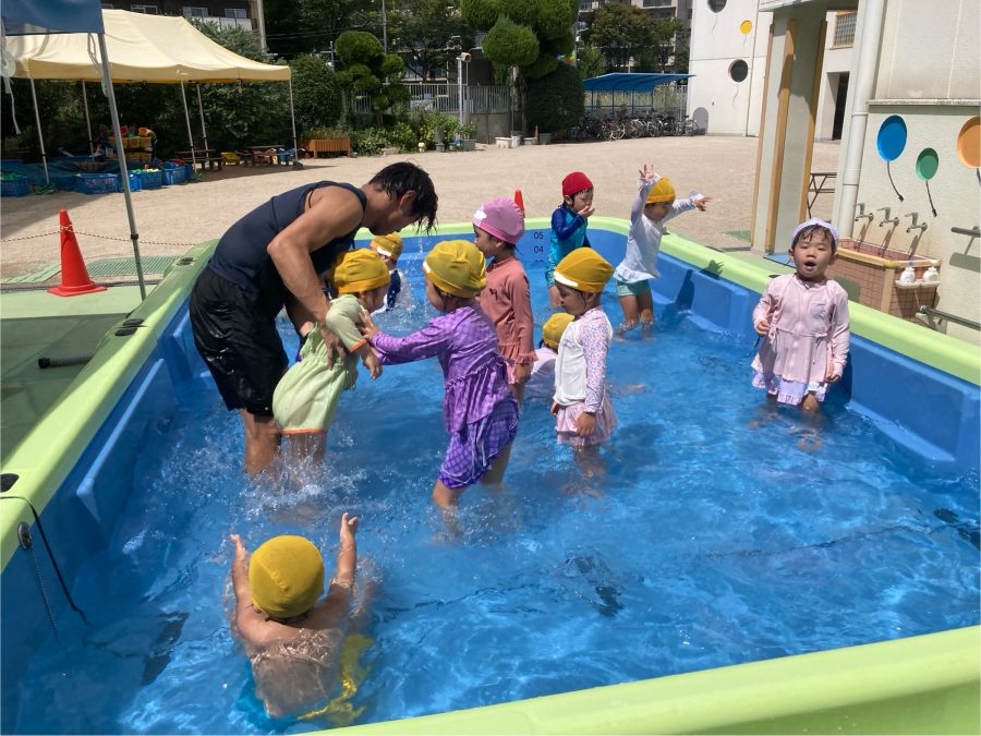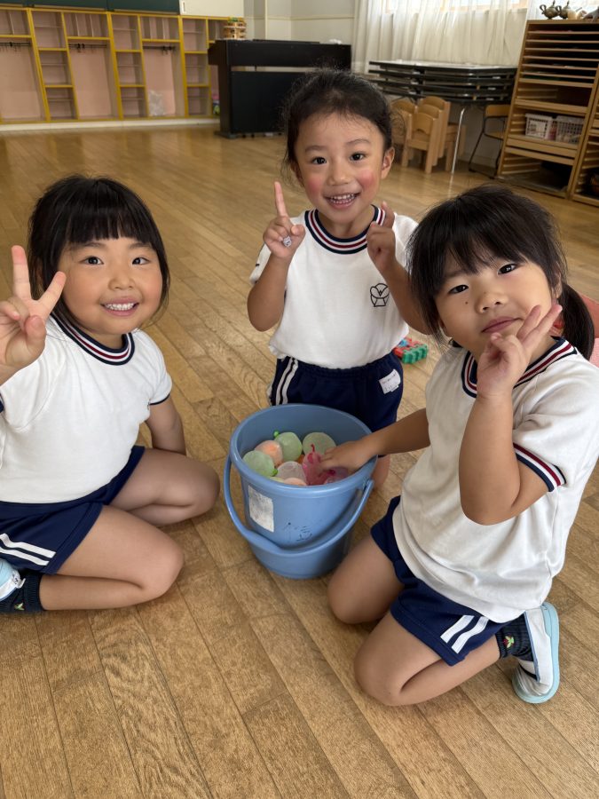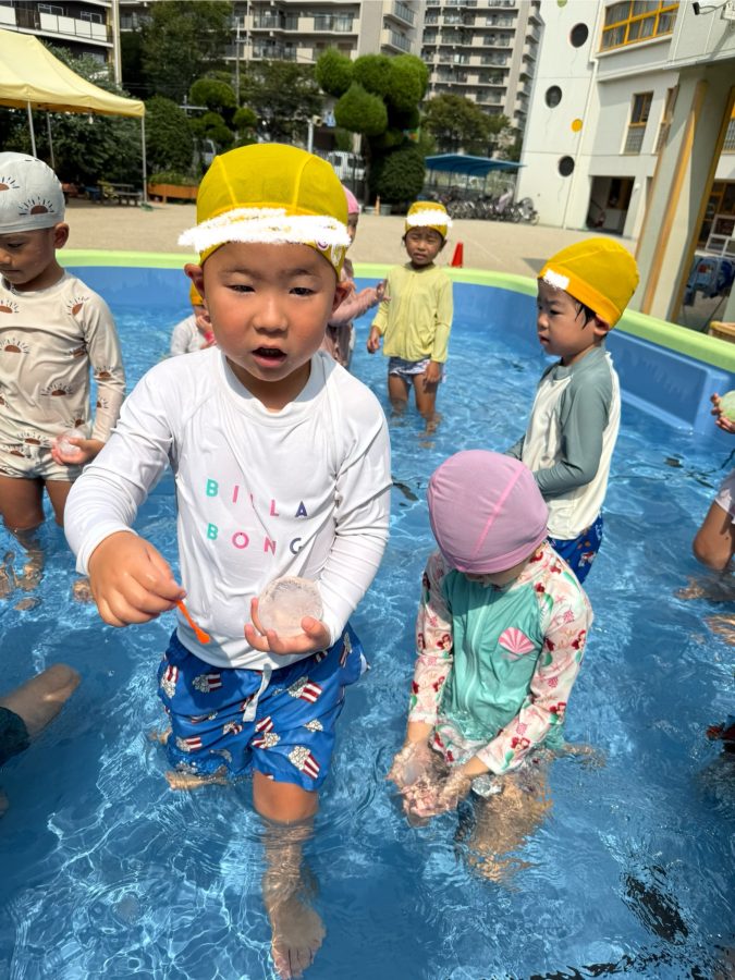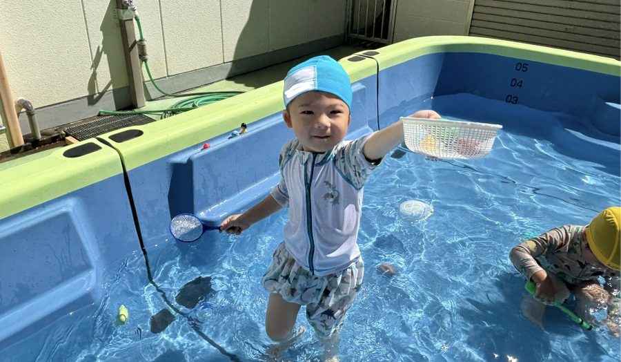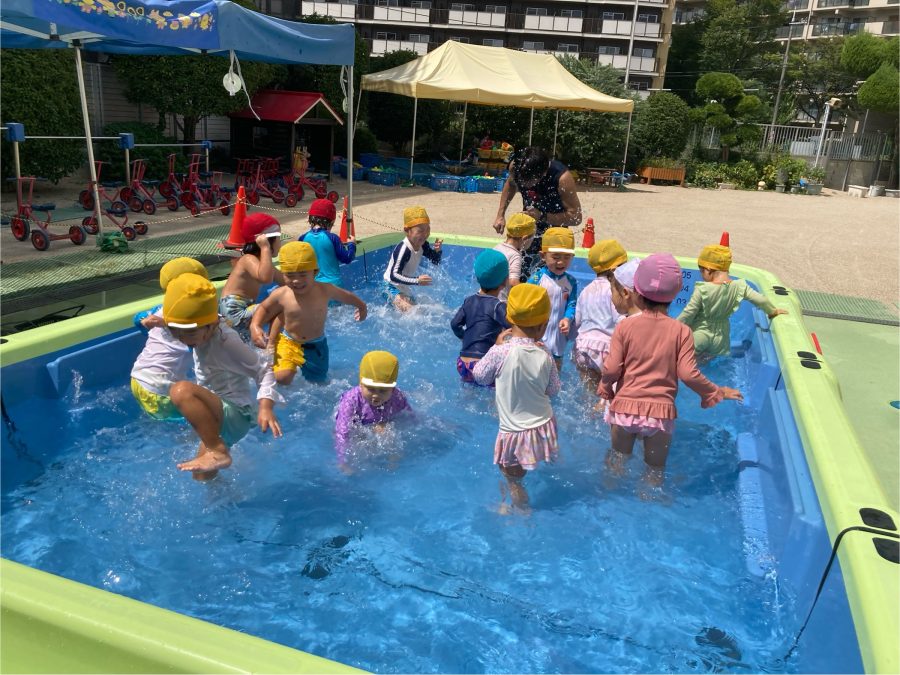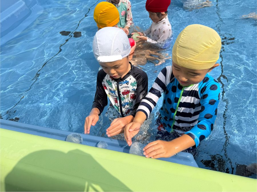 また、金曜日に台風が近づくとのことで、木曜日はプール自体が最後だろうと、赤組、桃組が合同で賑やかにプールを楽しみました!