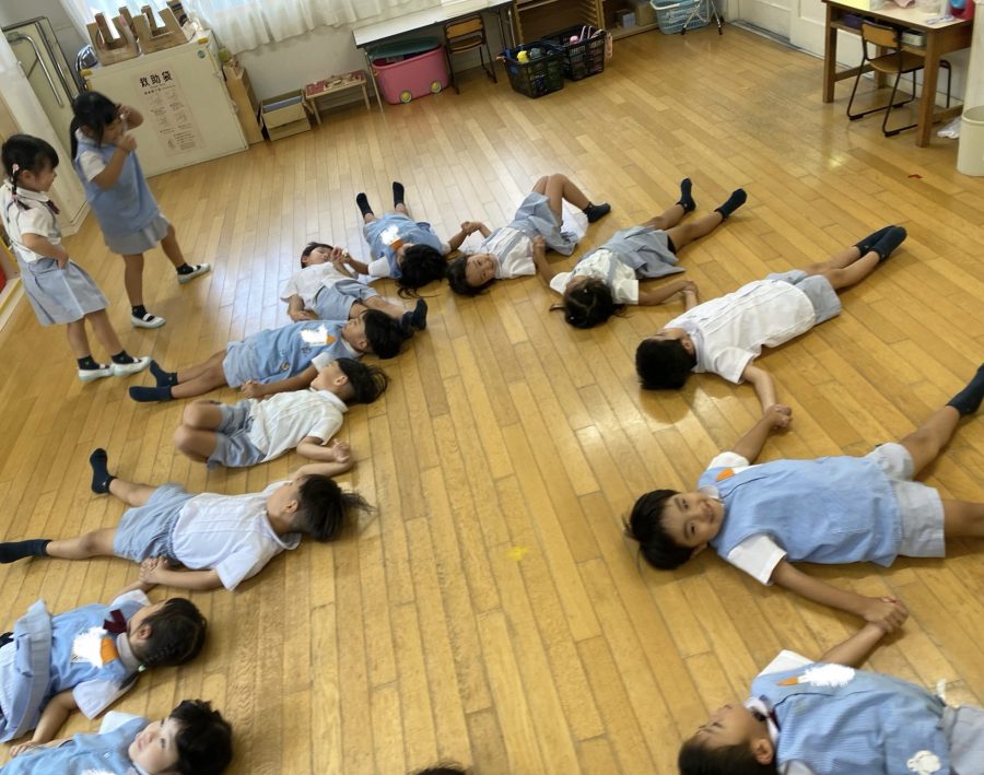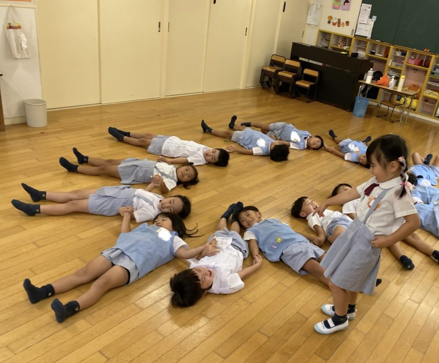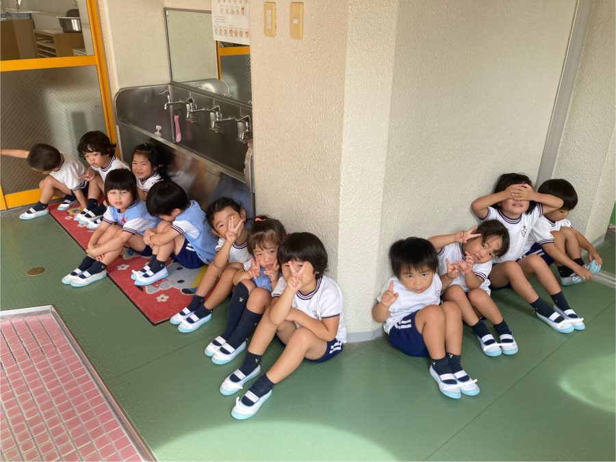 これは、全く関係ないですが、「おトイレのあと座って待っててね〜」と伝え、戻ってみてみると、並んでお利口さんに座って待っていた子どもたちを思わず撮った一枚です。かわいいですね😍