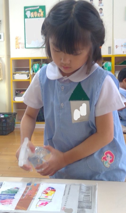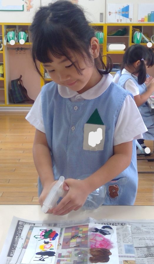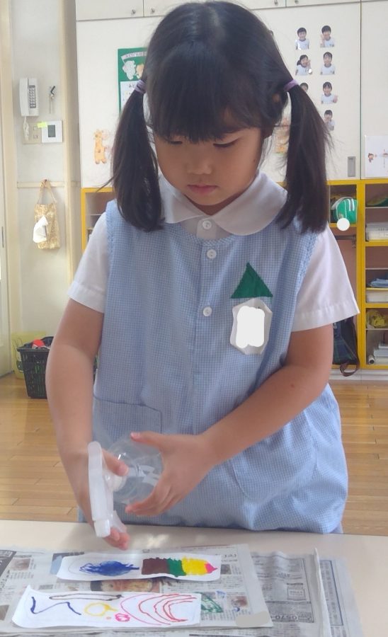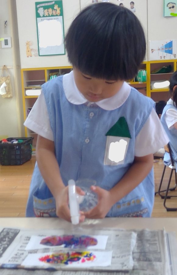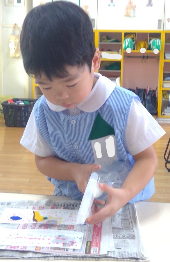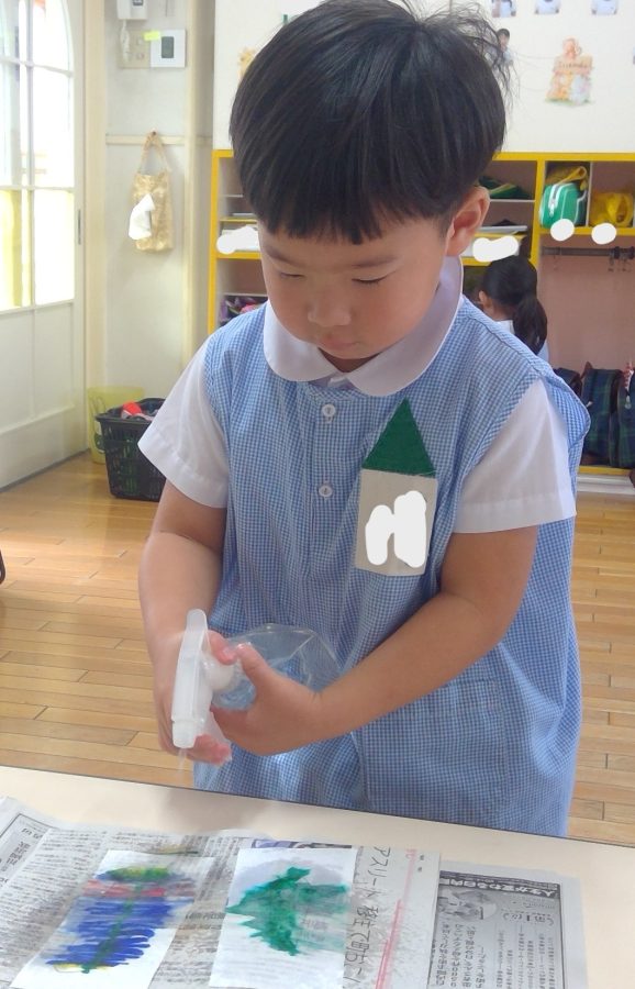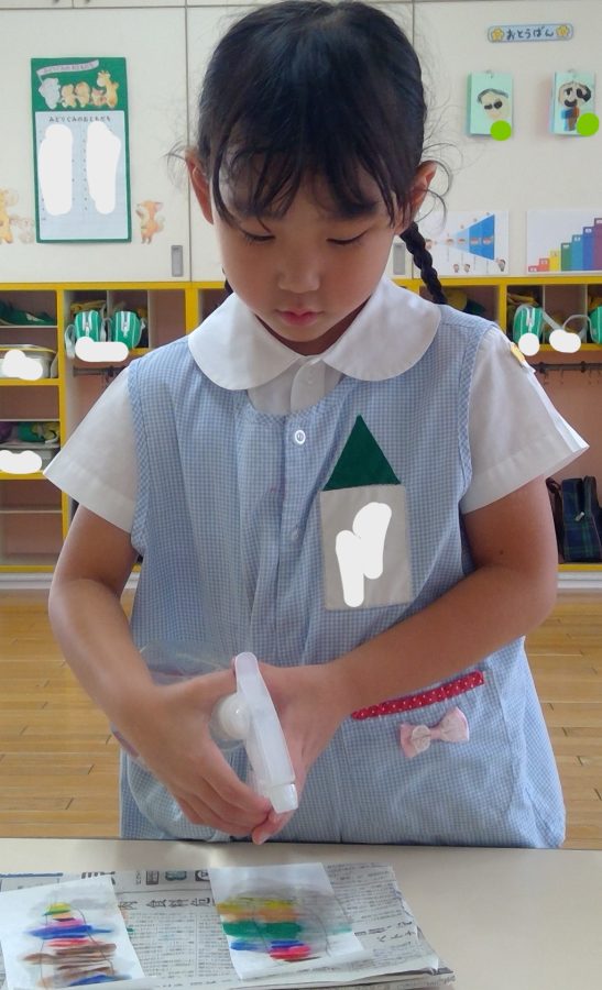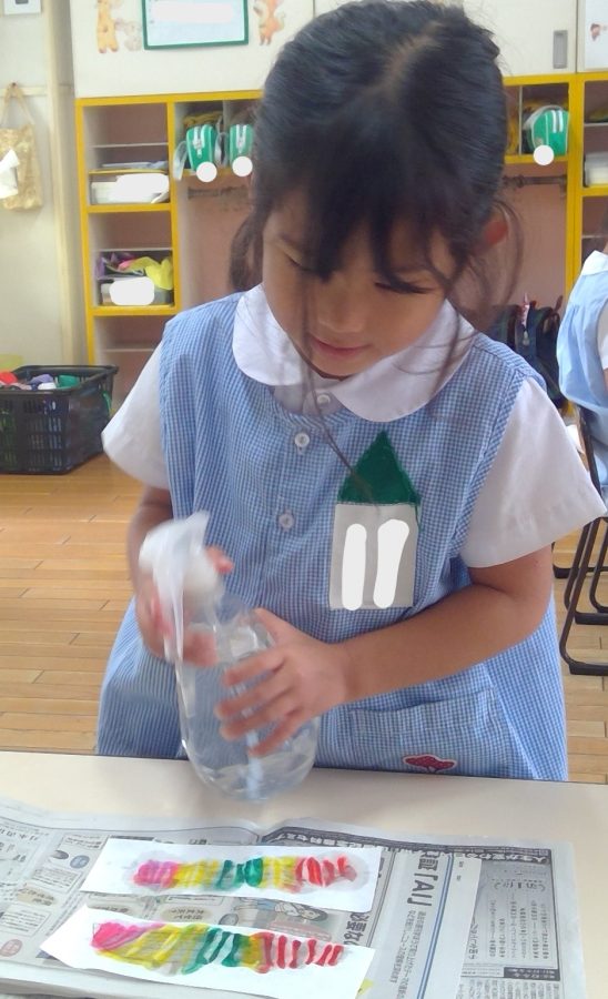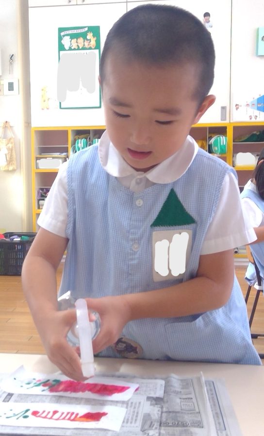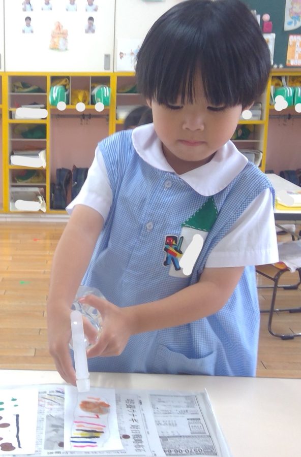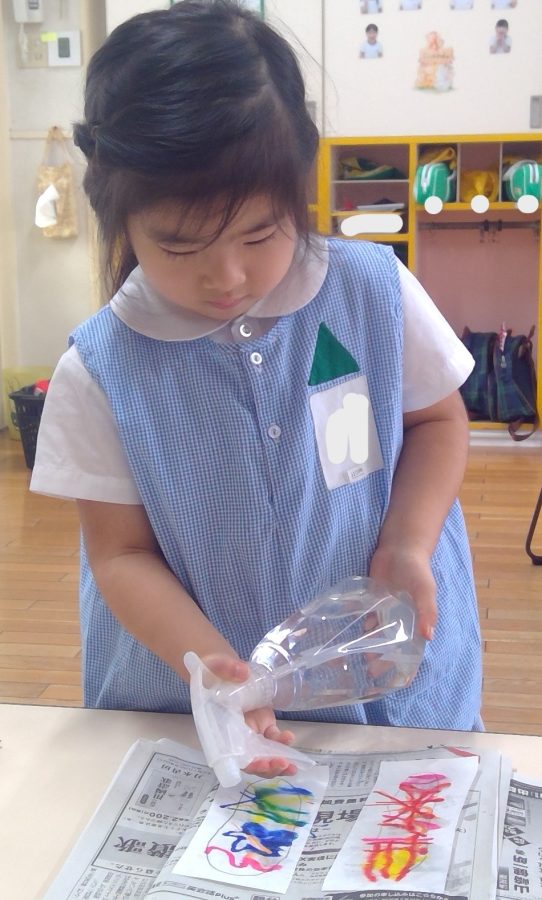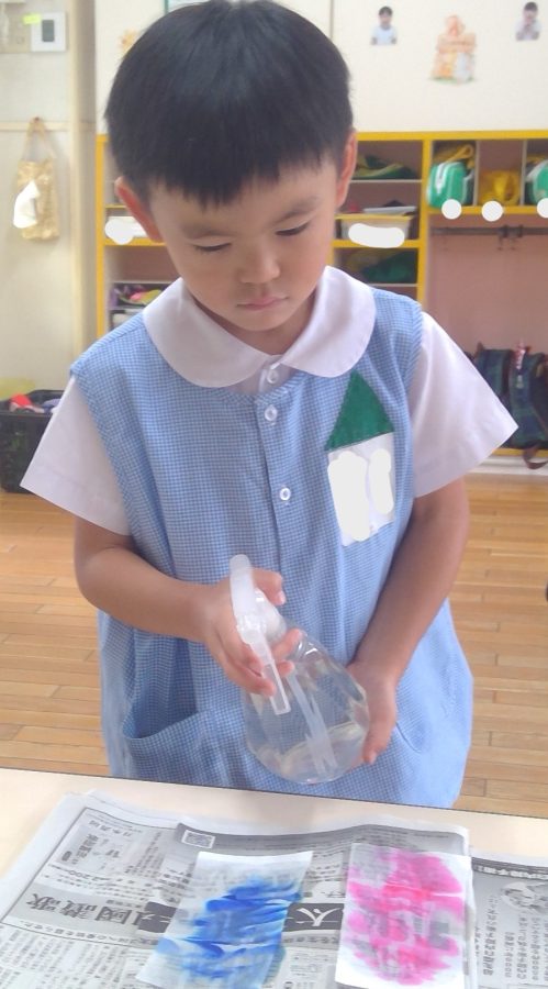 水性ペンで和紙に色をつけ、霧吹きで水をかけました。