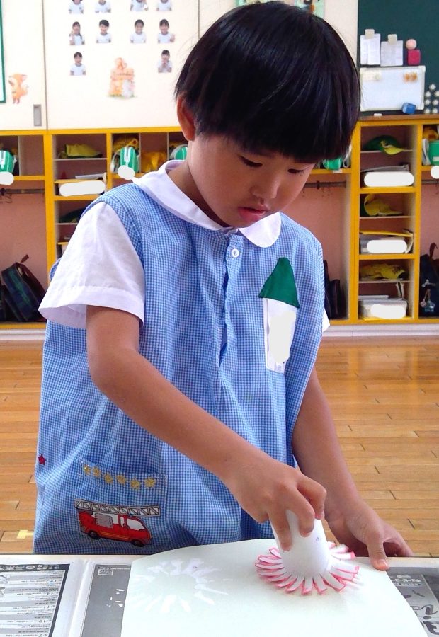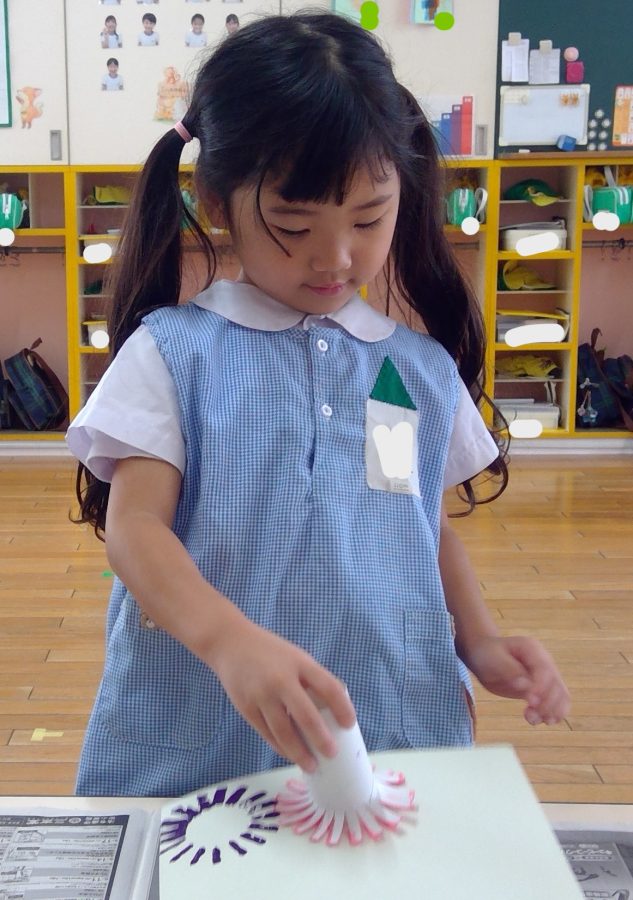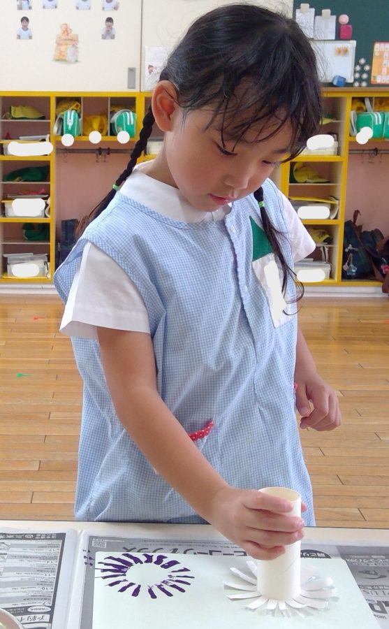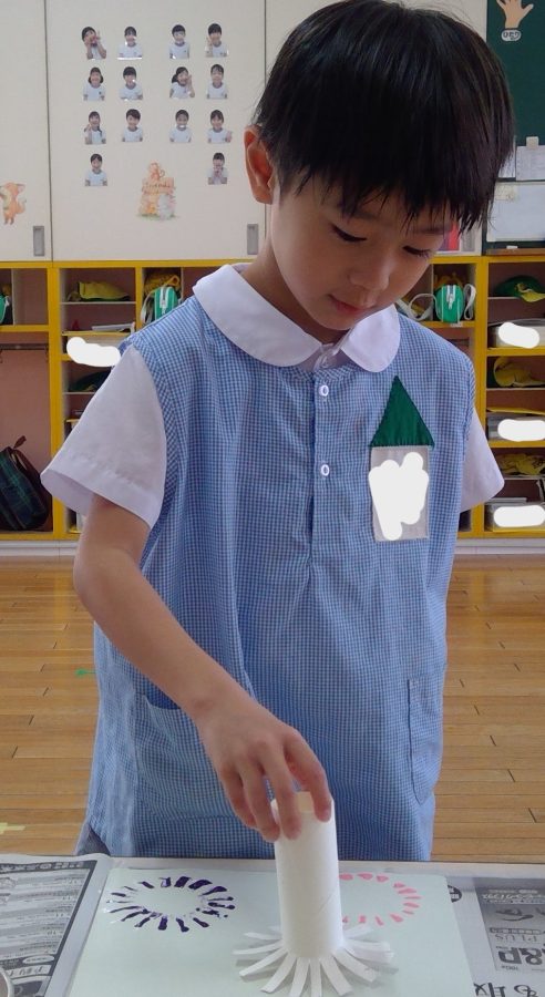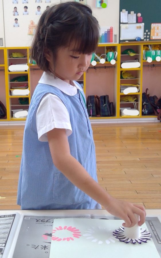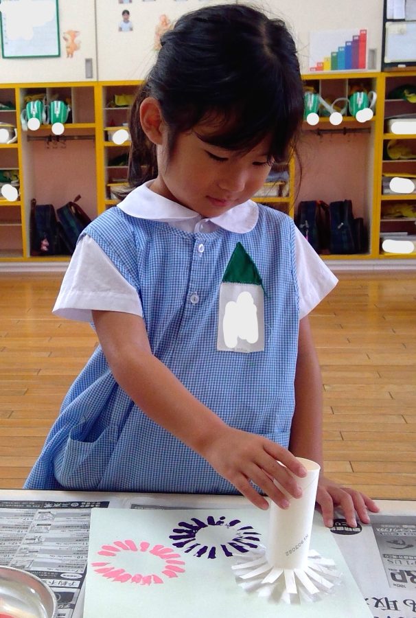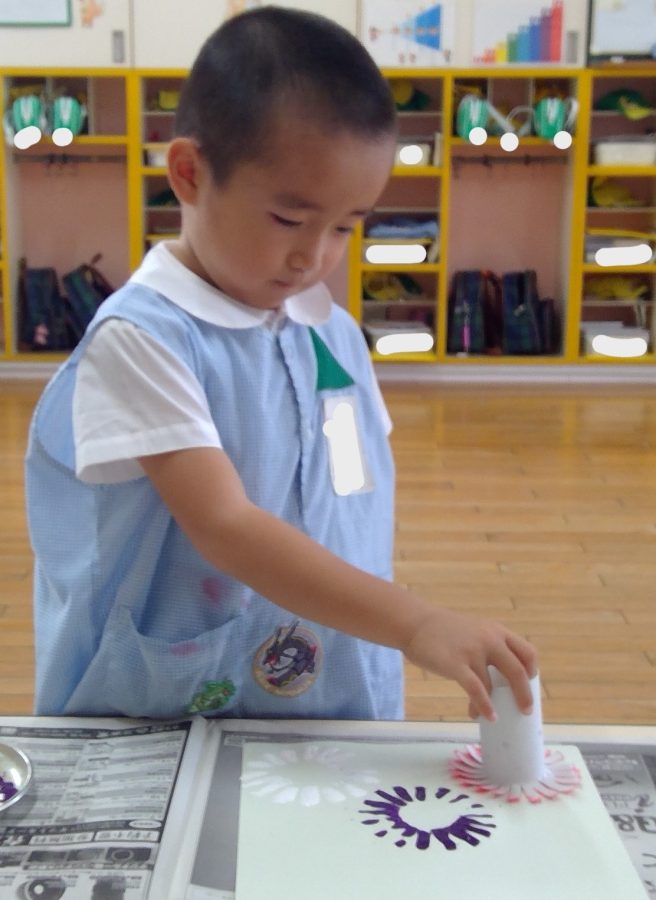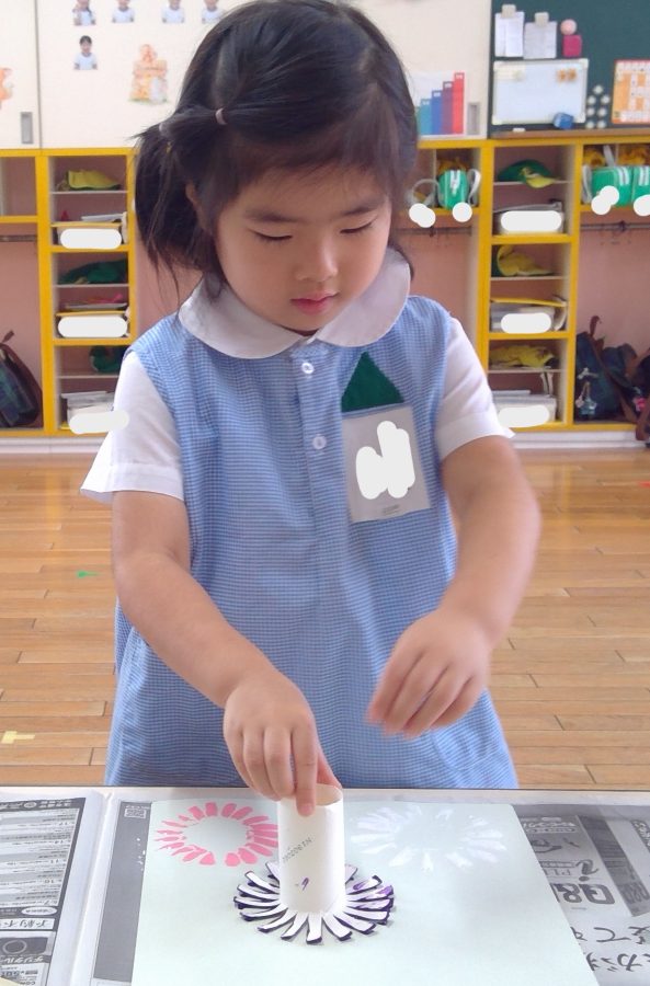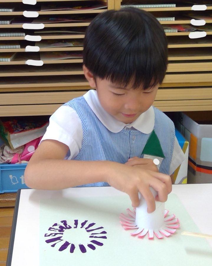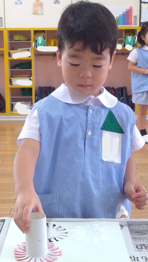 トイレットペーパーの芯を使って、絵の具でスタンプしました。
