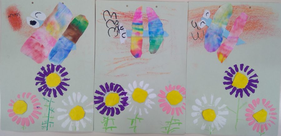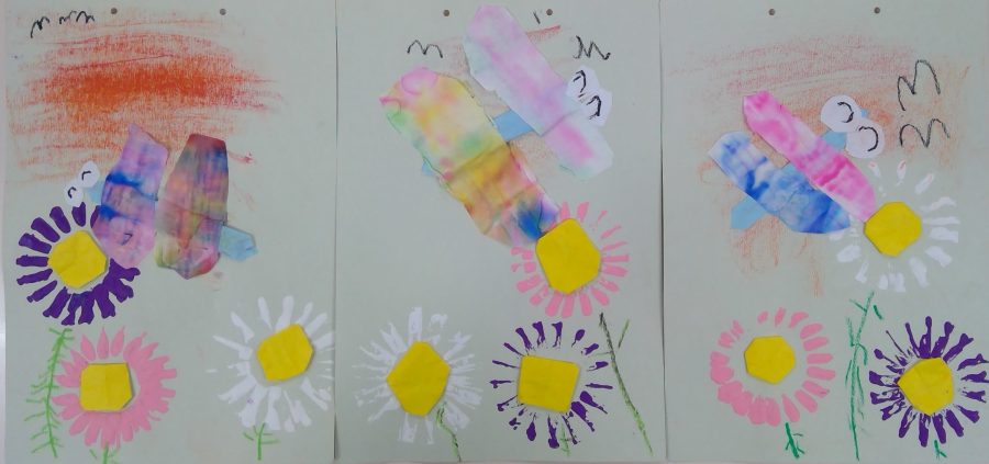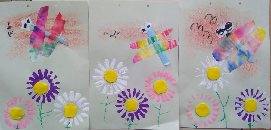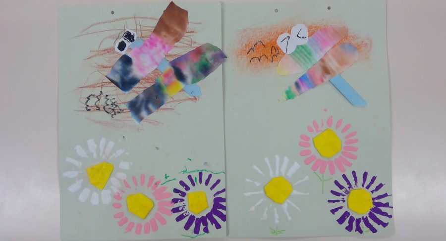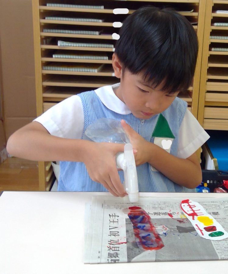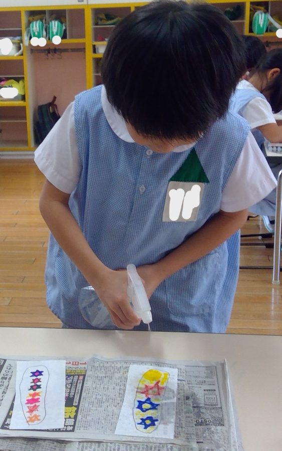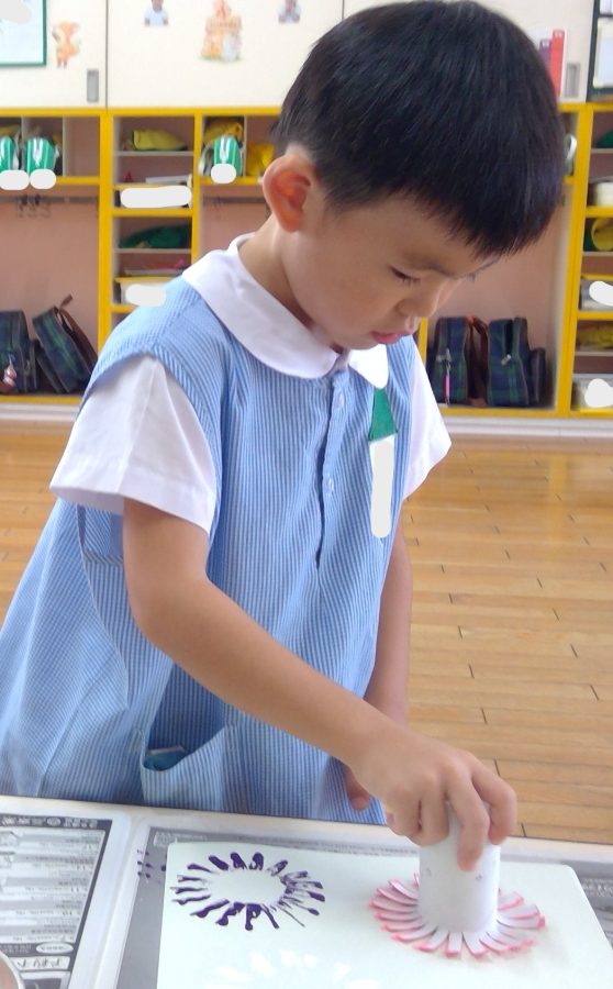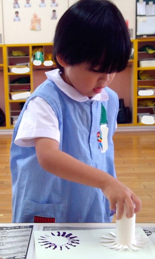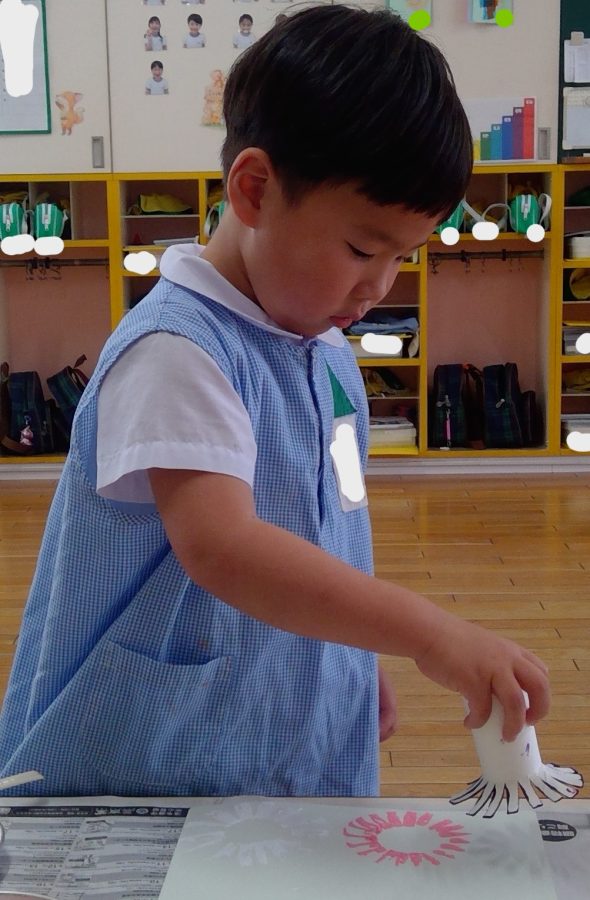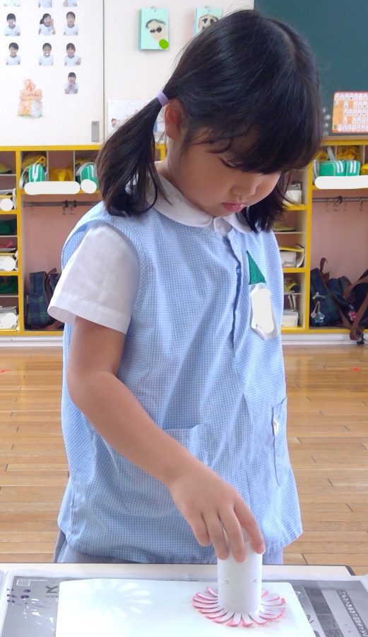 トイレットペーパーの芯を使って、絵の具でスタンプしました。