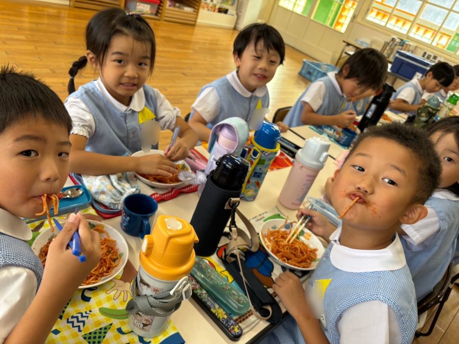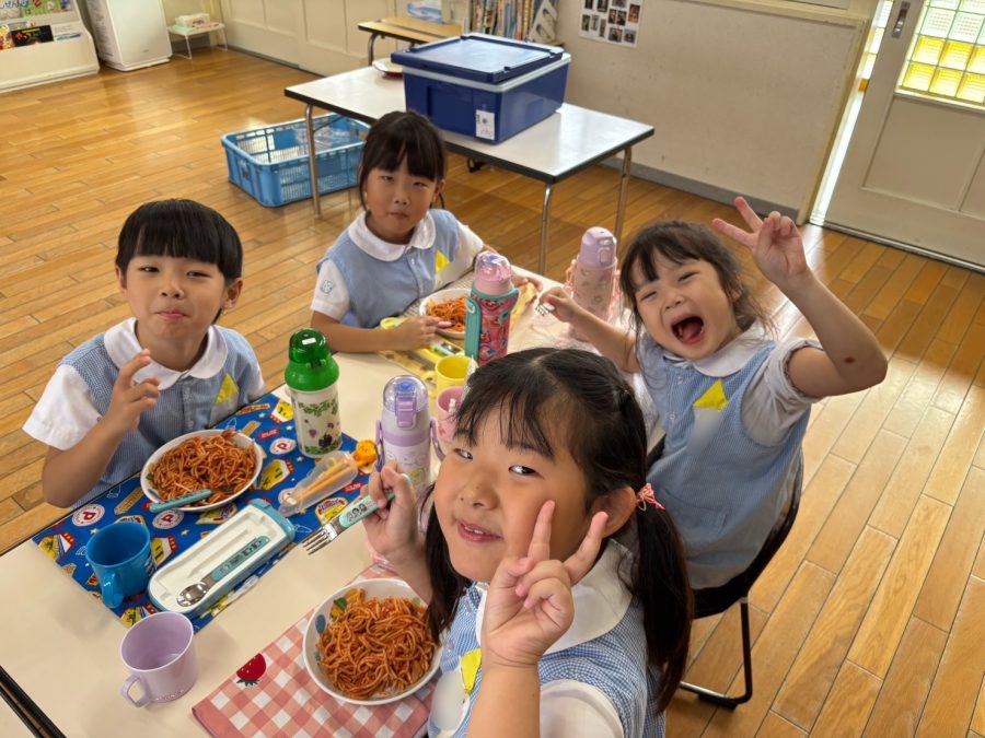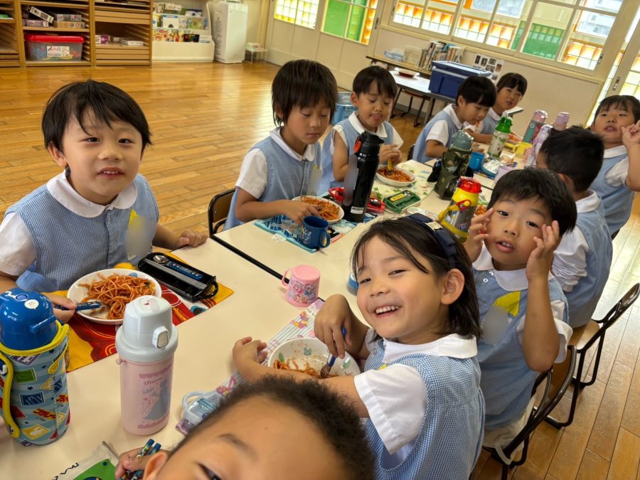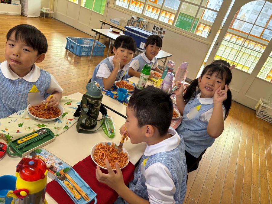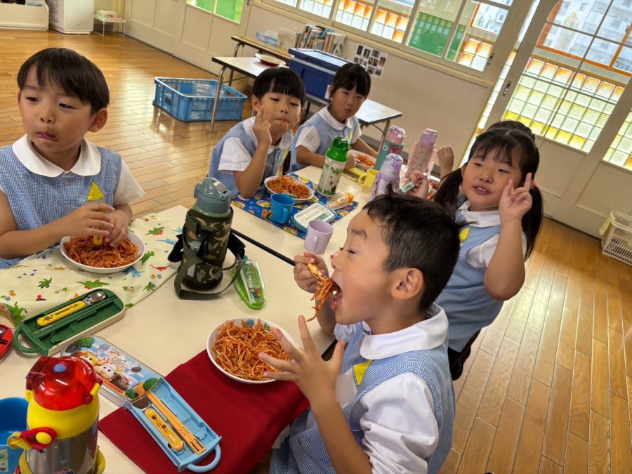 外遊びの後にホール練習へ行き、腹ペコな黄組さんたちはナポリタンを食べました😋🍝