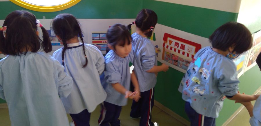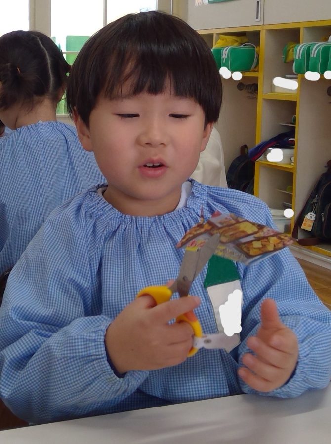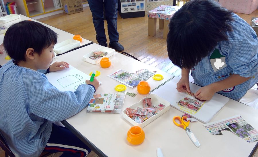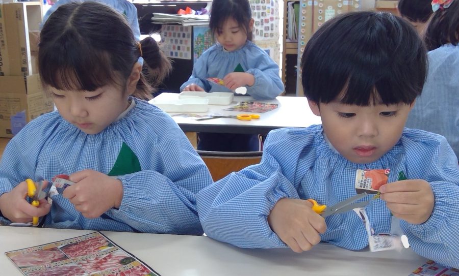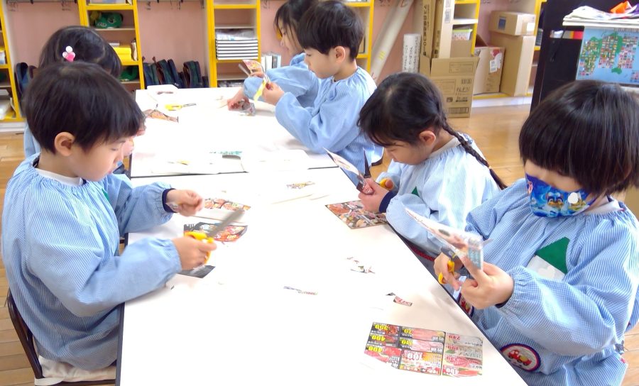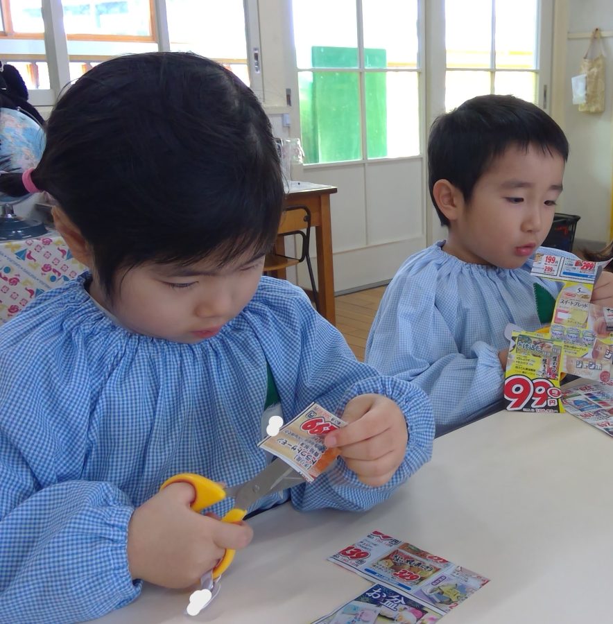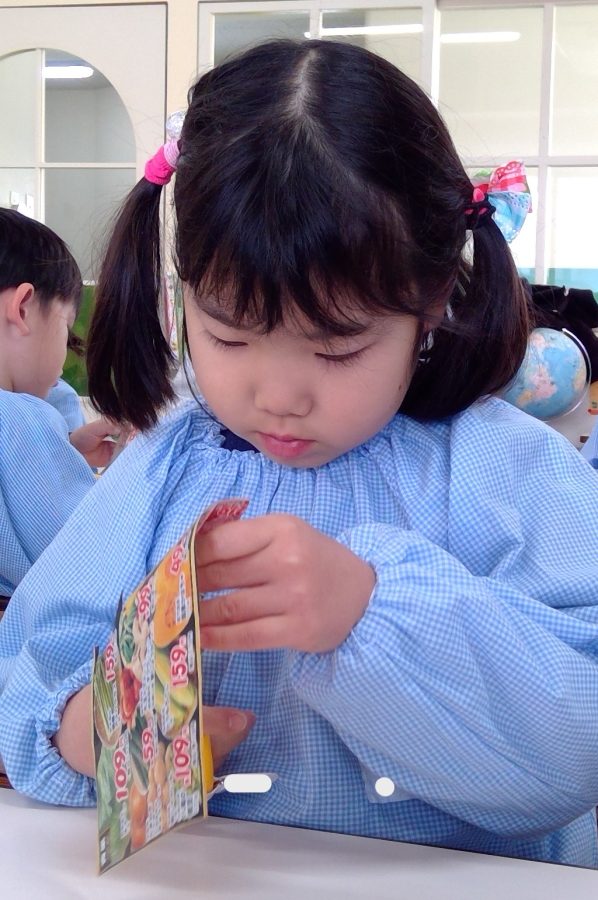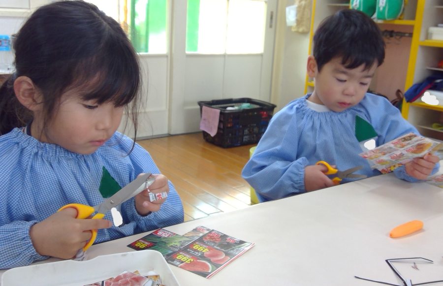 広告の中の好きな商品を切り抜いて、お店を完成させよう!という遊びをおこないました😊