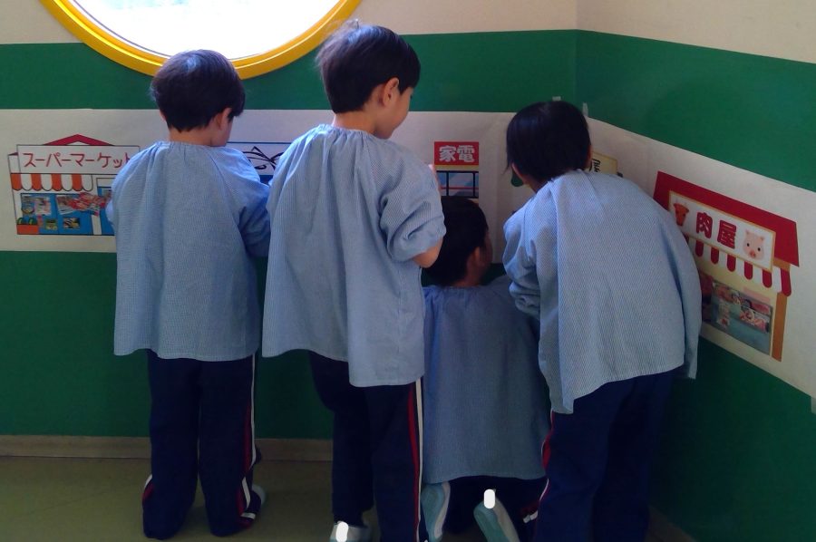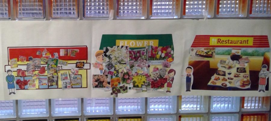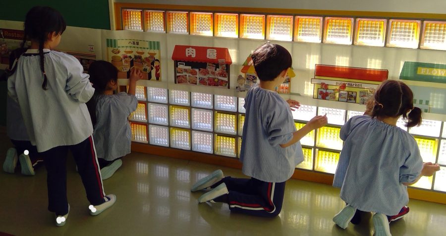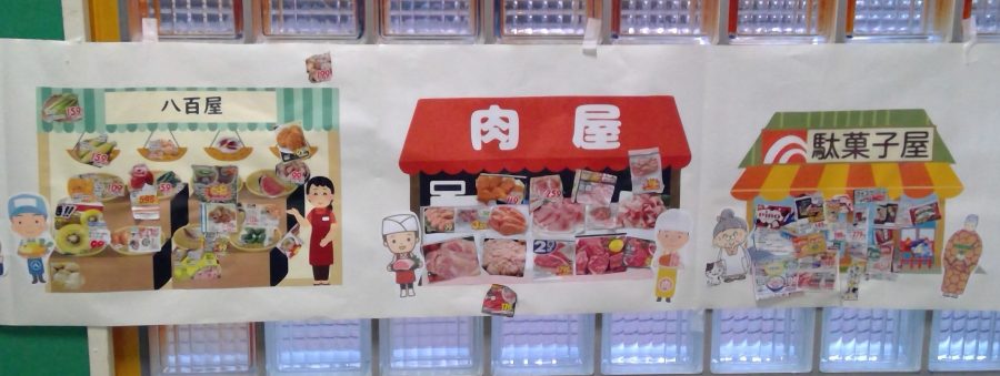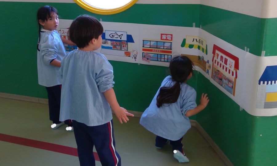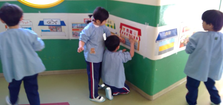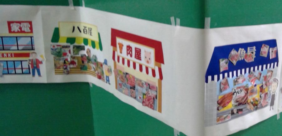 友だちと、どこに貼ろうか相談しながら、緑組の商店街が完成しました✨