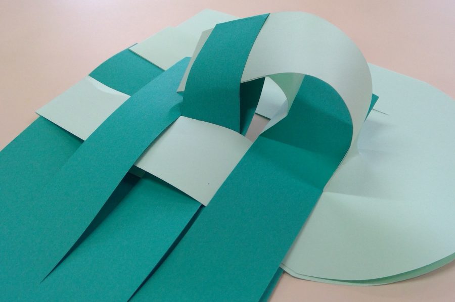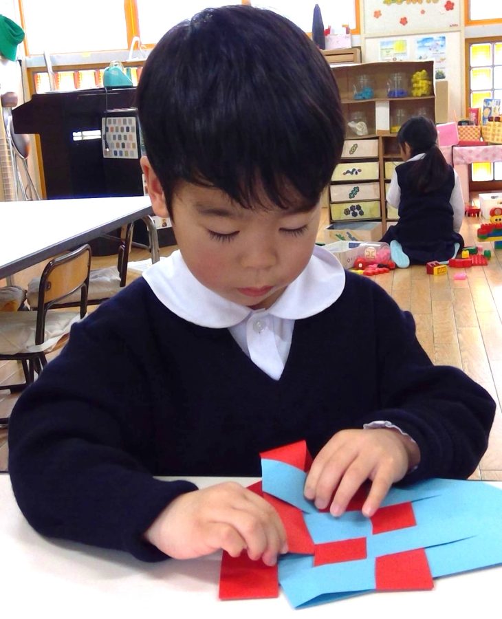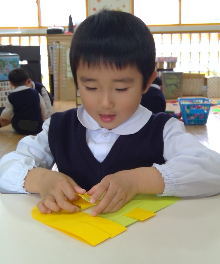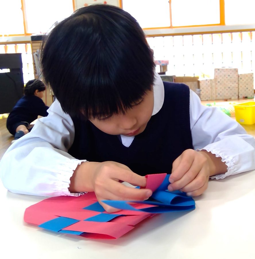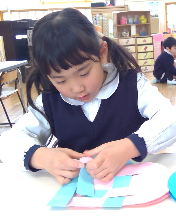 色が交互に出るように、それぞれの画用紙の間をくぐらせながら編んでいきます。