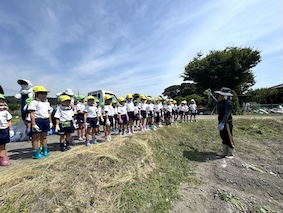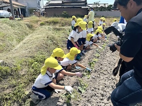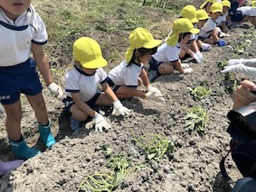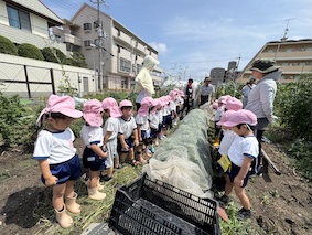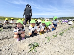 運動フェスティバルより前になりますが、年中・年長で神戸市西区の畑にサツマイモの苗植えへ行ってきました!