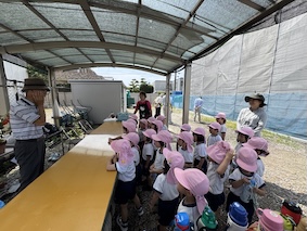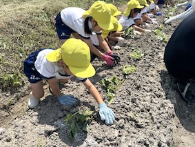 本来なら1人3本の苗を植えるのですが、あまりの暑さと照り返しに年中組は1人1本、年長組は1人2本がんばって植えました!