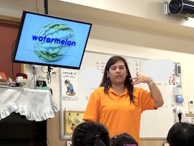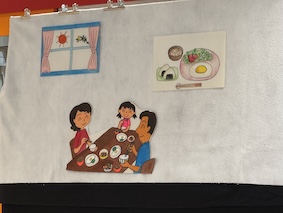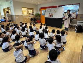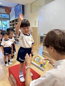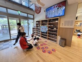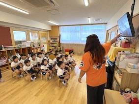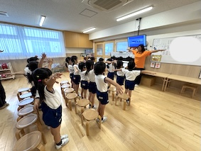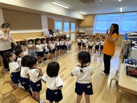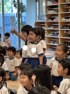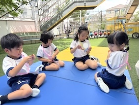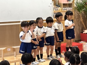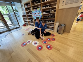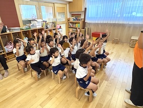 お部屋でも繰り返し行うことで、子どもたちの英語への興味関心をこれからも伸ばしていきたいと思っています。