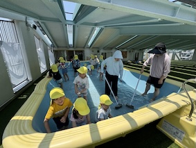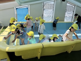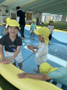 プールがはじまる前には、年長くじら組のお友だちが昨年から使っていなかったプールを綺麗に掃除してくれました。