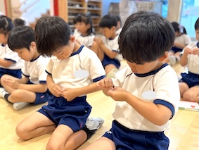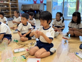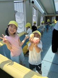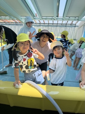 どこからともなく飛んできた虫が、水に入ってしまったりハプニングもありましたが、みんなニコニコ笑顔でがんばってくれました♪