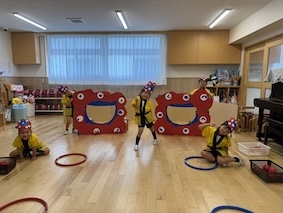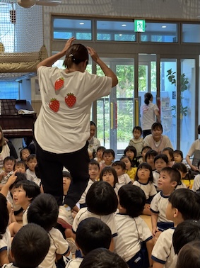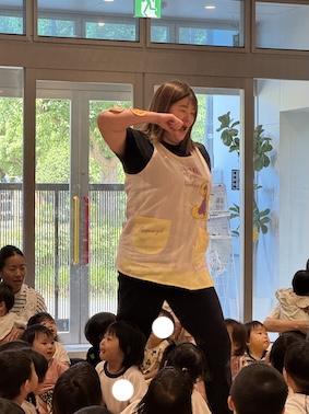 みんなは毎日ちゃんと食べてますか〜!?と聞くと「パン食べた!」「バナナ食べた!」「おにぎり食べた〜」とたくさんの声が返ってきました。