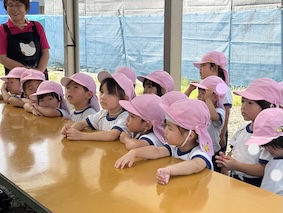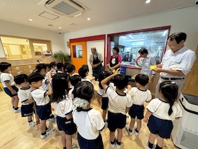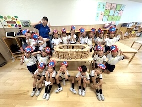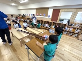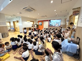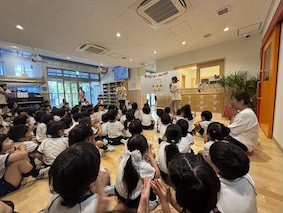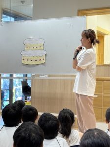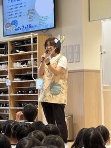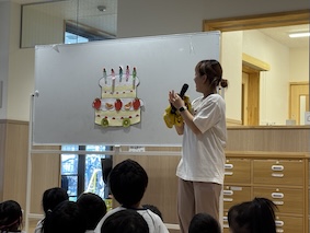 6月の末には、食育教室のボランティアをされている「いずみ会」の皆様が来園してくださり、子どもたちへ向け「朝ごはんを食べること」「よく噛んで食べること」の大切さを教えてくださいました。