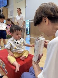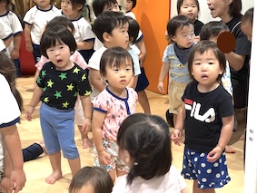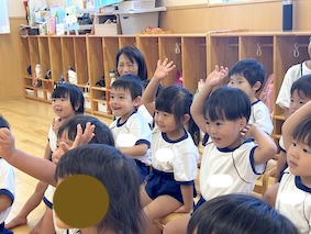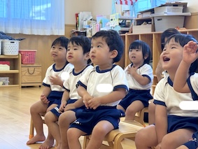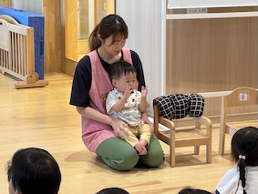 1歳になったばかりのお友だちも、先生のお膝の上でみんなの拍手に合わせて手をたたく姿がかわいすぎます。