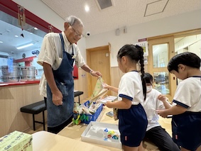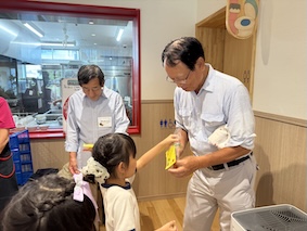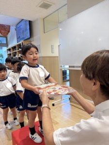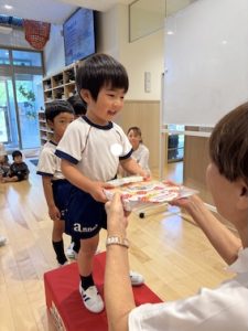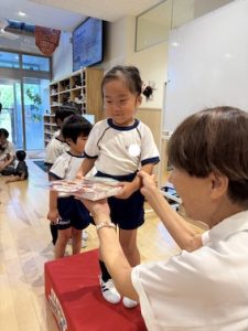 初めてのことだけど動じず、しっかりと手を出して受け取るお友だち。