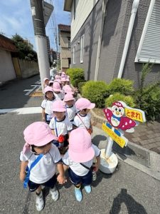 先生がオーバーリアクションで指差し確認をすることで子どもたちがマネをし、自分の身を自分で守る意識を高めます。
